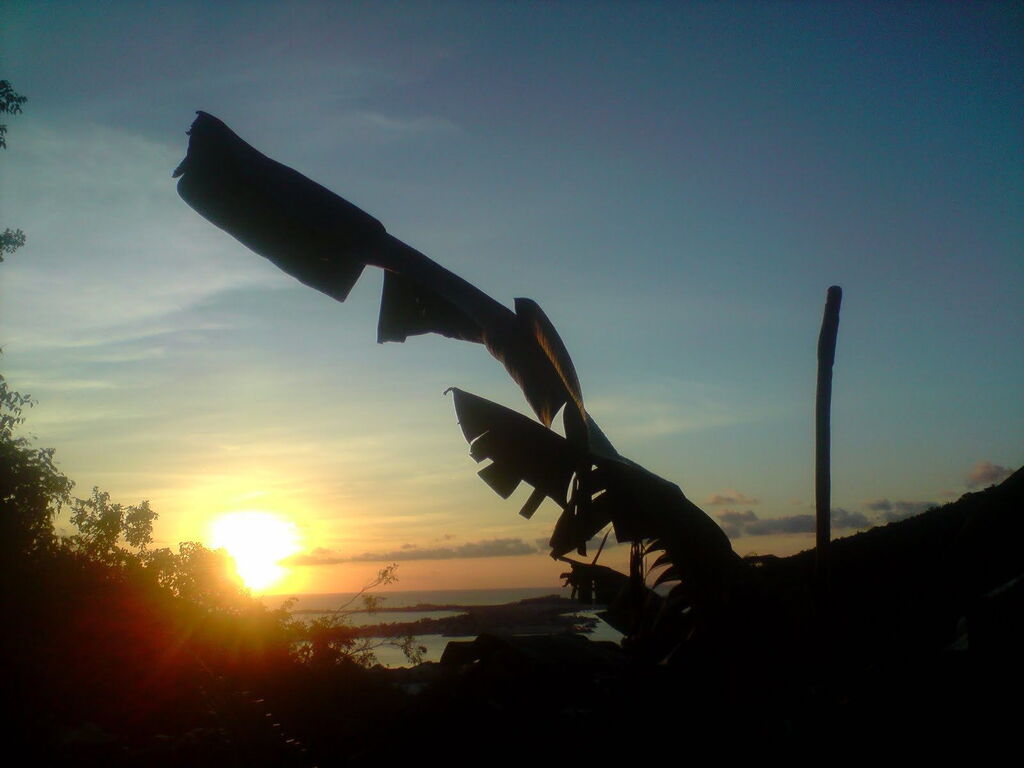 A travers les palmiers, un dernier rayon de coucher de soleil, île de Saint-Martin, Antilles françaises