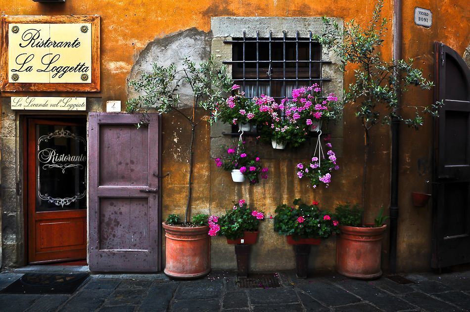 Ristorante La Logetta, Cortona, Tuscany, Italy. This was taken at 6.00 am. Just by luck, a restaurant owner appeared in the morning and opened the door to revel a sign on the door glass.