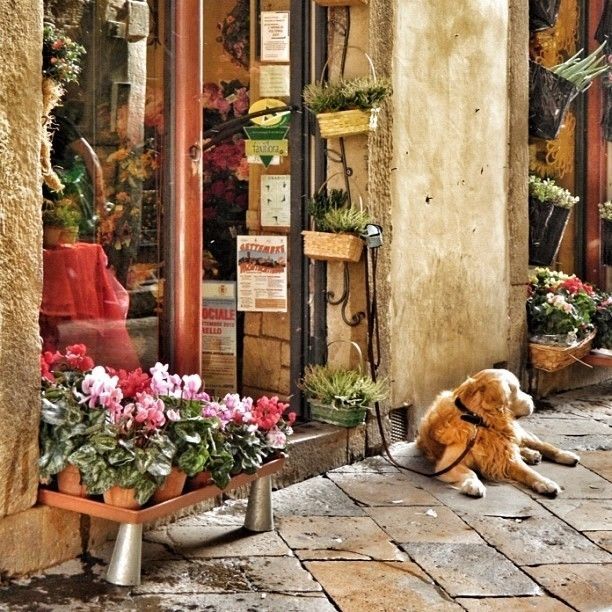 A Golden Retriever lounges in the morning sun while it's Owner visits with the Florist. Taken in Volterra, Italy.