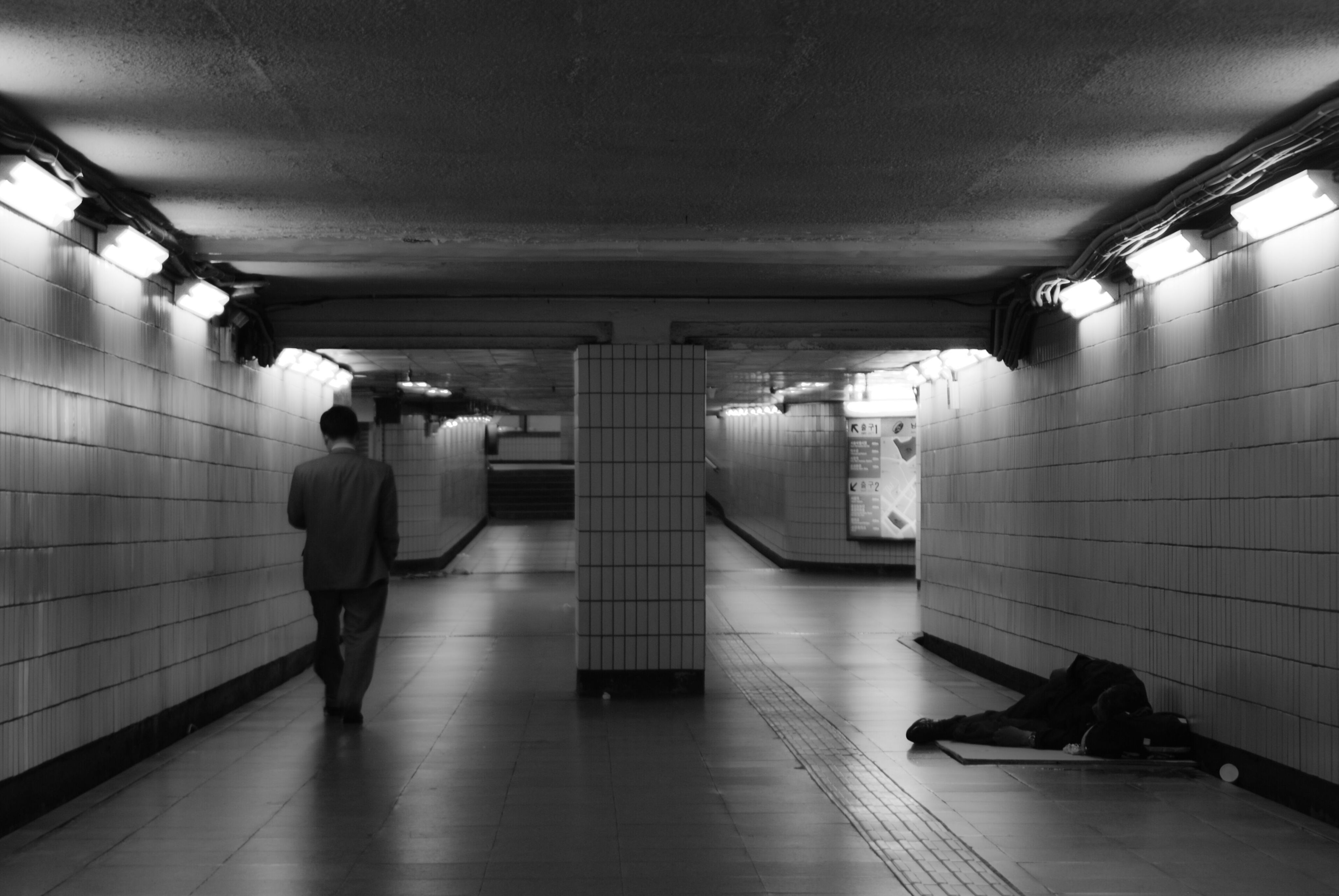 A businessman passes a homeless man in an underpass in Seoul, South Korea