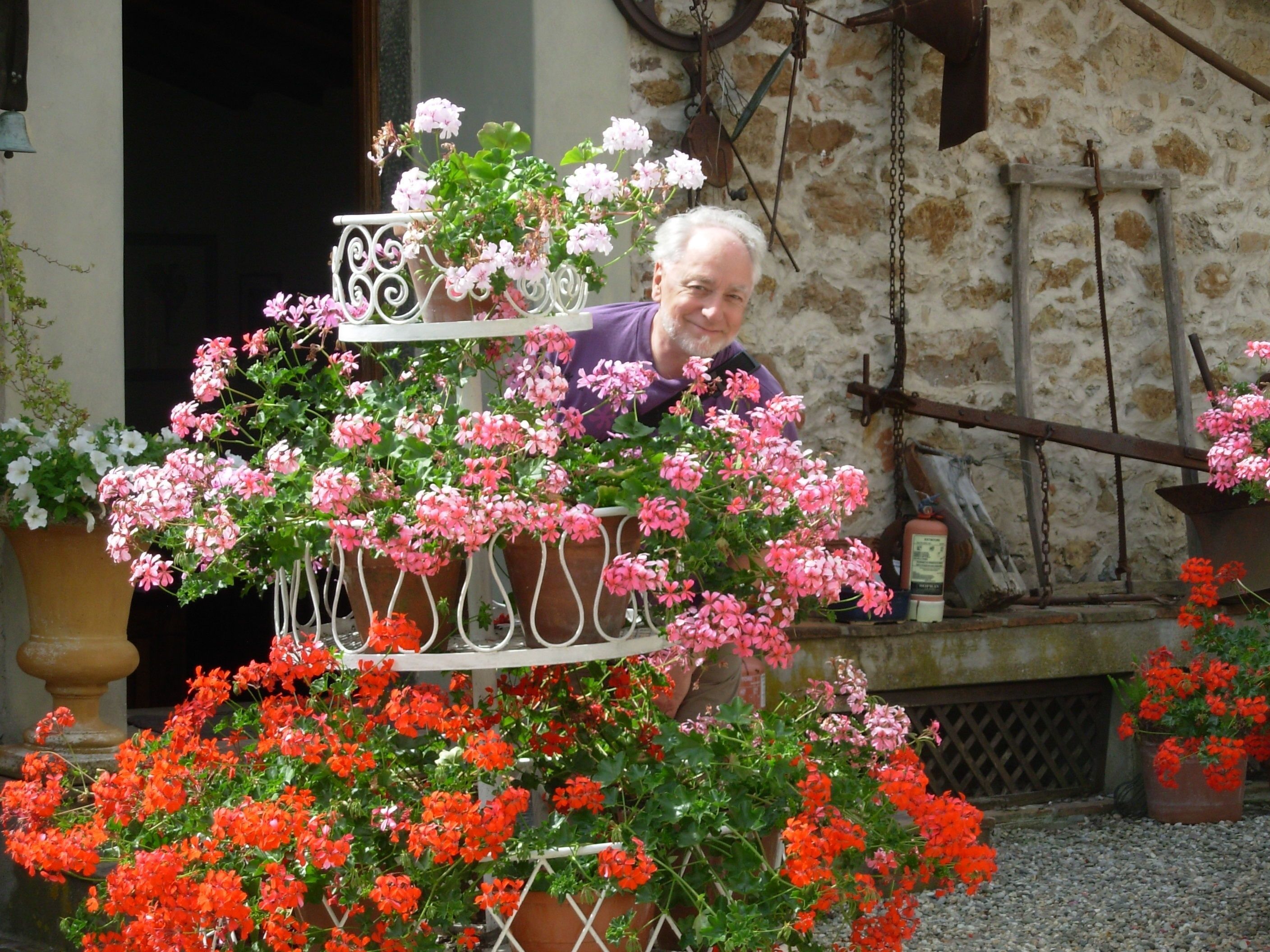 In June, outside the frantoio at Fattoria Colle Verde, the geraniums are in beautiful bloom!