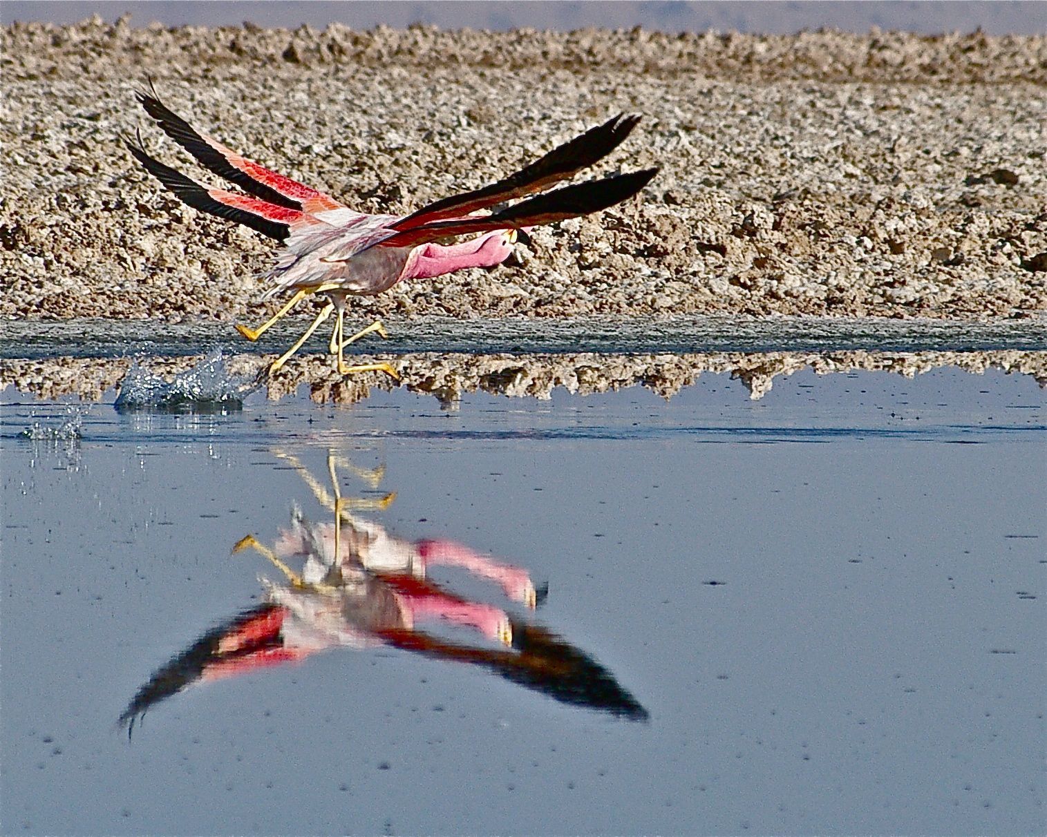 I photographed these flamingoes as they took flight from a lagoon in the salt flats in the Atacama Desert, Chile. I love this photo because it's hard to tell which legs and wings belong to which bird. The photo was taken in October, 2011.