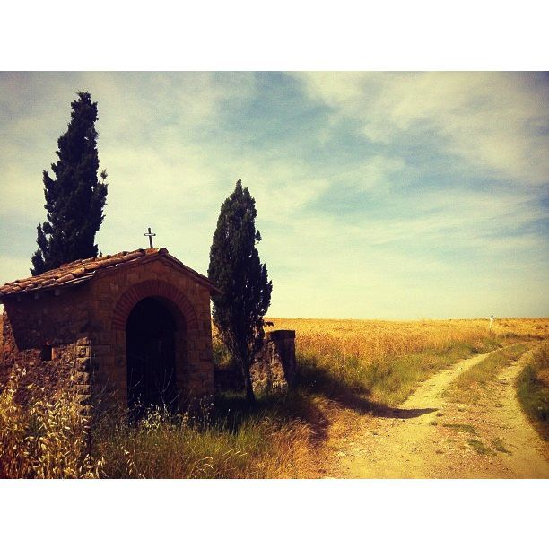 We were driving a lot across Tuscany and we always took the smaller roads to enjoy the landscape and to be able to stop and admire the nature and take photos. One day we were driving when I saw this small cottage like busstop with the ceder trees on the side. It was very film like.