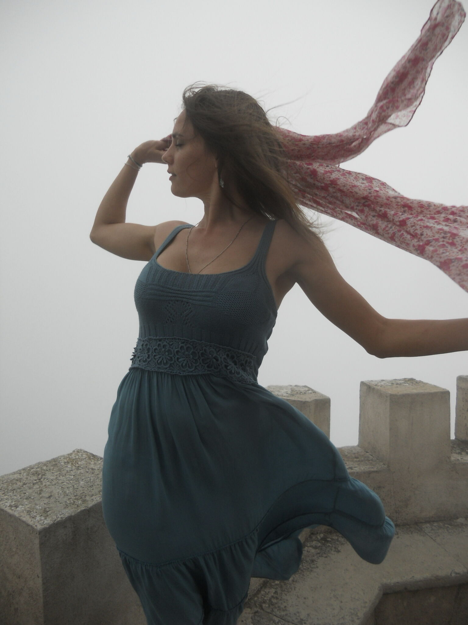 My friend and I went on a trip to Erice (Sicily) and, as the weather at the foot of the Mount was sunny, we were excited about going up to take some colourful pics. Instead, we found this thick fog and wind. While my friend was pessimistic about taking pics, I set up self-timer and proved her wrong.
