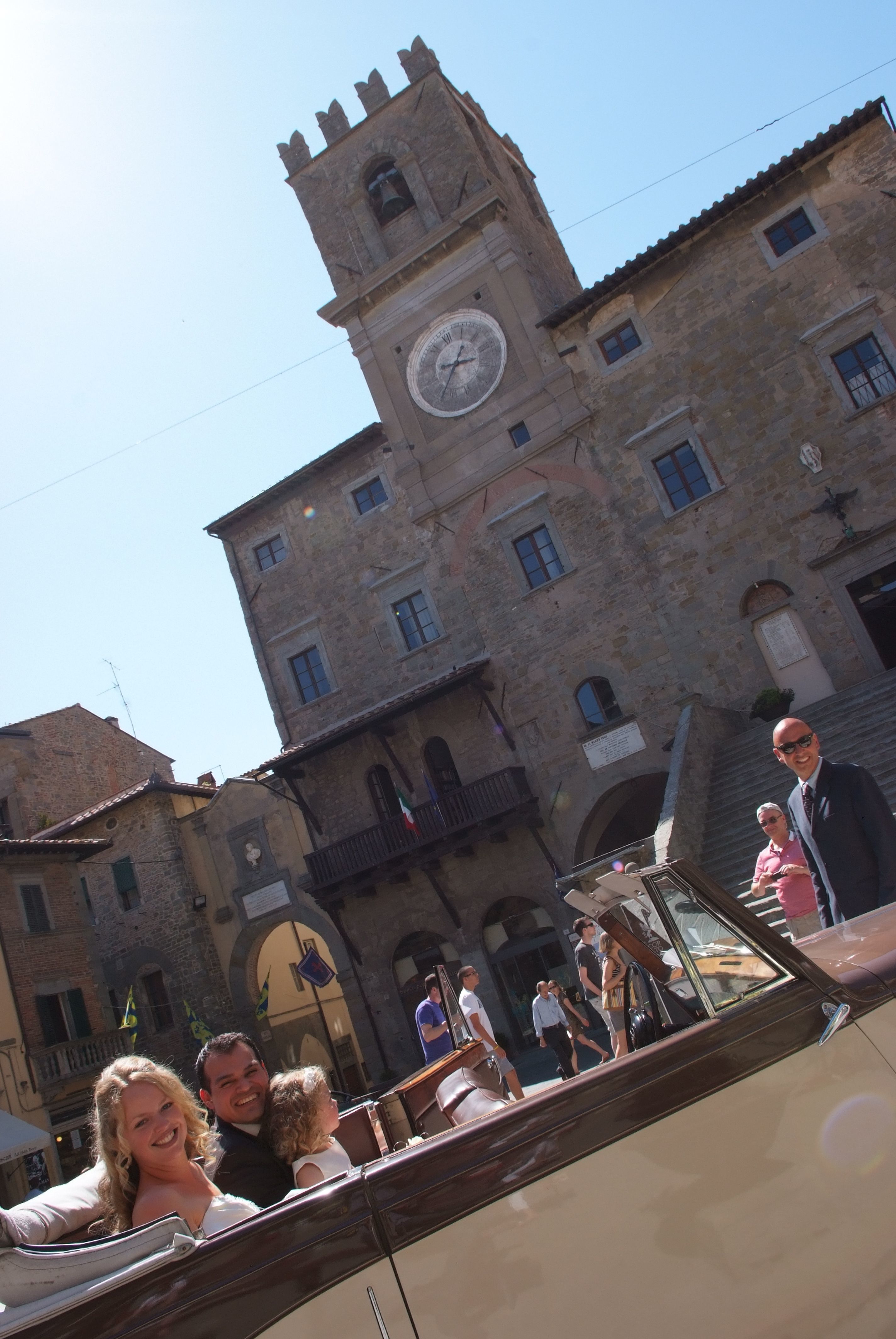 Dressed and ready to go, we found our wedding car waiting for us outside the steps of Casa Ivan ready to chauffer us down towards Cortona. Leaving our villa high upon the hill we slowly made our winding descent towards the waiting hour. Entering its walled medieval delights our car began to chug up its steep narrow streets towards the town’s very heart and where we were to be married.