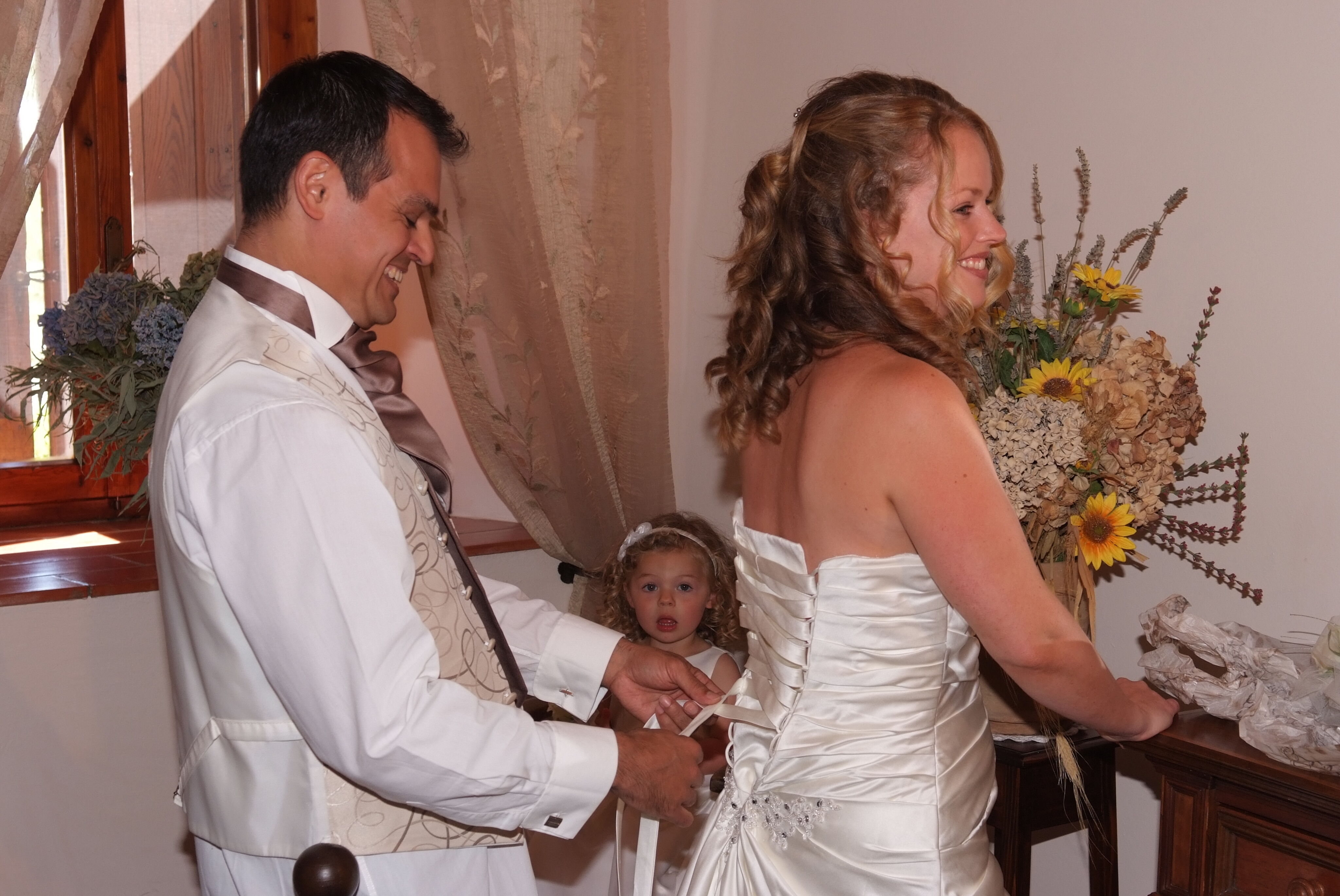 Smiling, I gently opened the wooden shutters of our villa. Shafts of golden sunlight streamed through, slowly spreading light across the small room to where my wedding dress lay. Turning tradition entirely on its head, my husband-to-be entered laughing, hand in hand with our daughter Amelie, to help me prepare. It was just the three of us. We had eloped and I had a complicated dress. Choosing the dress with my heart, it was rather clear I hadn’t used my head, as Pablo patiently helped me into it, tying the intricate bodice at the back; this was one secret that was being shared before the correct hour.