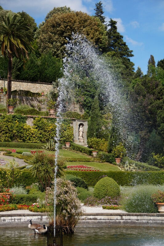 A black swan made a bow for a curtsying welcome and a fountain spread the water in the wind on sounds of harp. I went up, on the slope, among statues and take a break on each terrace to see the perspective. I said "Hello" to the monkeys, I looked with a dog to a mosaic and I heard the story of the man which have to keep a barrel with water on his shoulder for ever.
