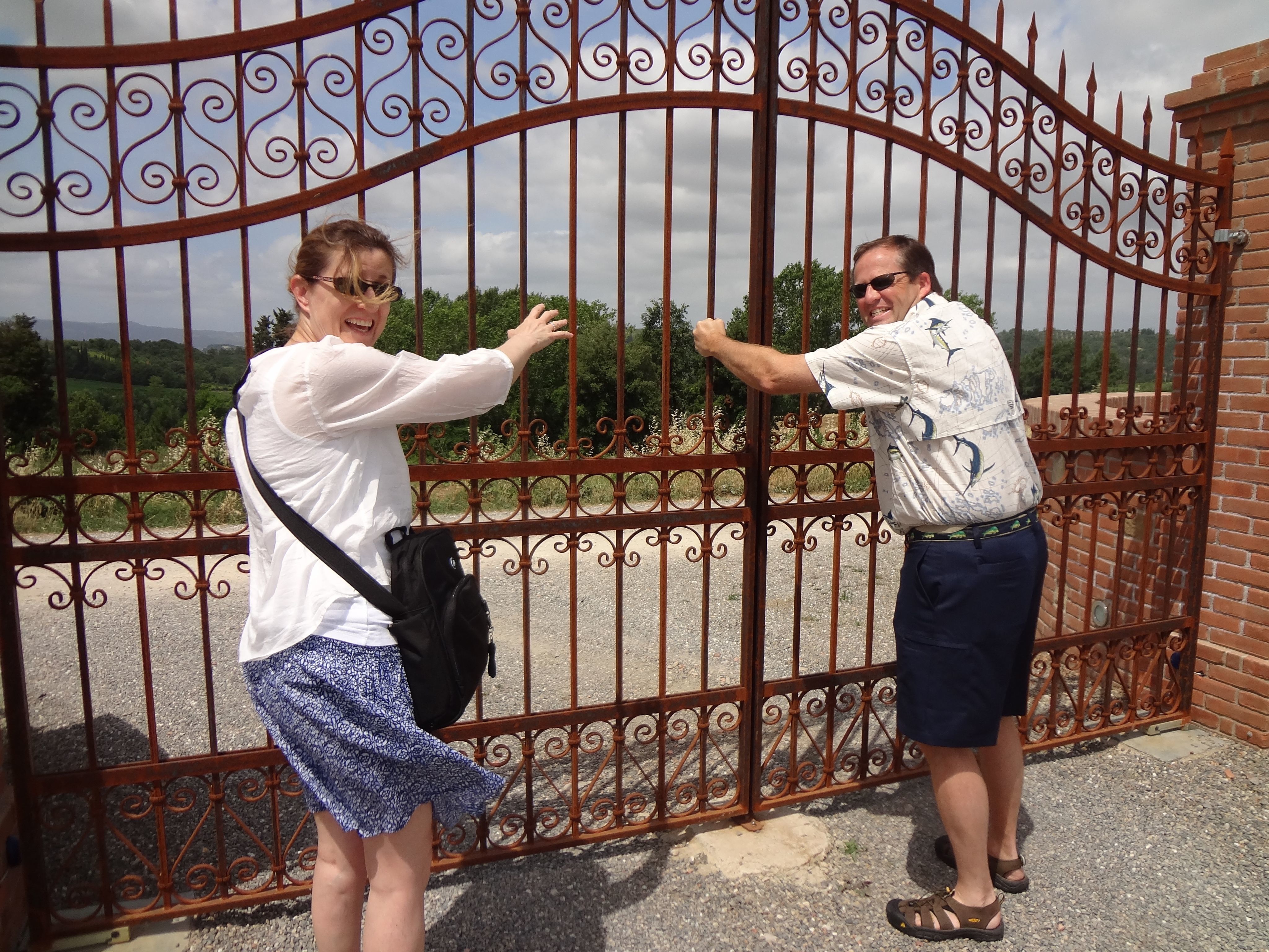 By mid morning the rest of my group was ready to drive to Volterra. We assembled our day packs and headed to the car. As we gathered by the car Doug asked my husband Jeff, “Hey, do you have the opener for the gate?” Jeff said, “No. It must be inside”. We all scrambled back inside in search of the driveway gate opener. Frantically looking for the opener, we dreaded the next and most obvious thought….our other friends took off with both gate openers in their possession. The gate was closed and we were trapped!! UGH!