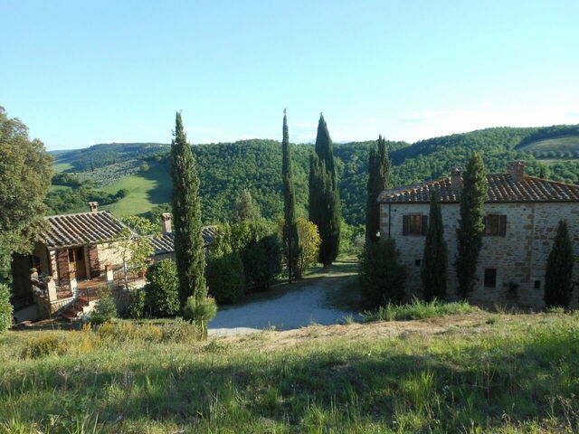 There is a large shaded terrace with breathtaking views over the Tuscan countryside and the nearby medieval city of Montepulciano, perfect to have your morning espresso or evening glass of wine, from one of the many vineyards around the area.