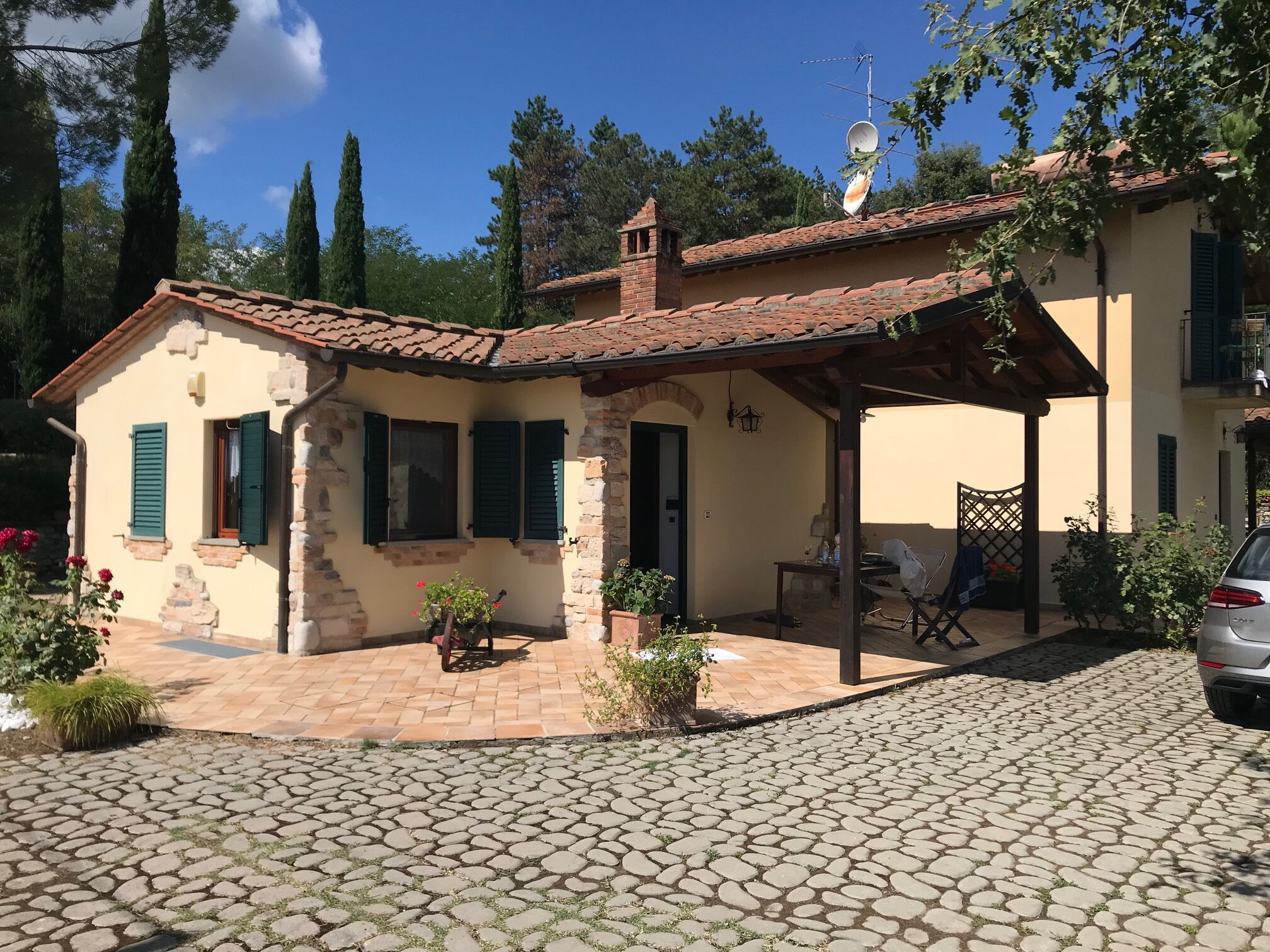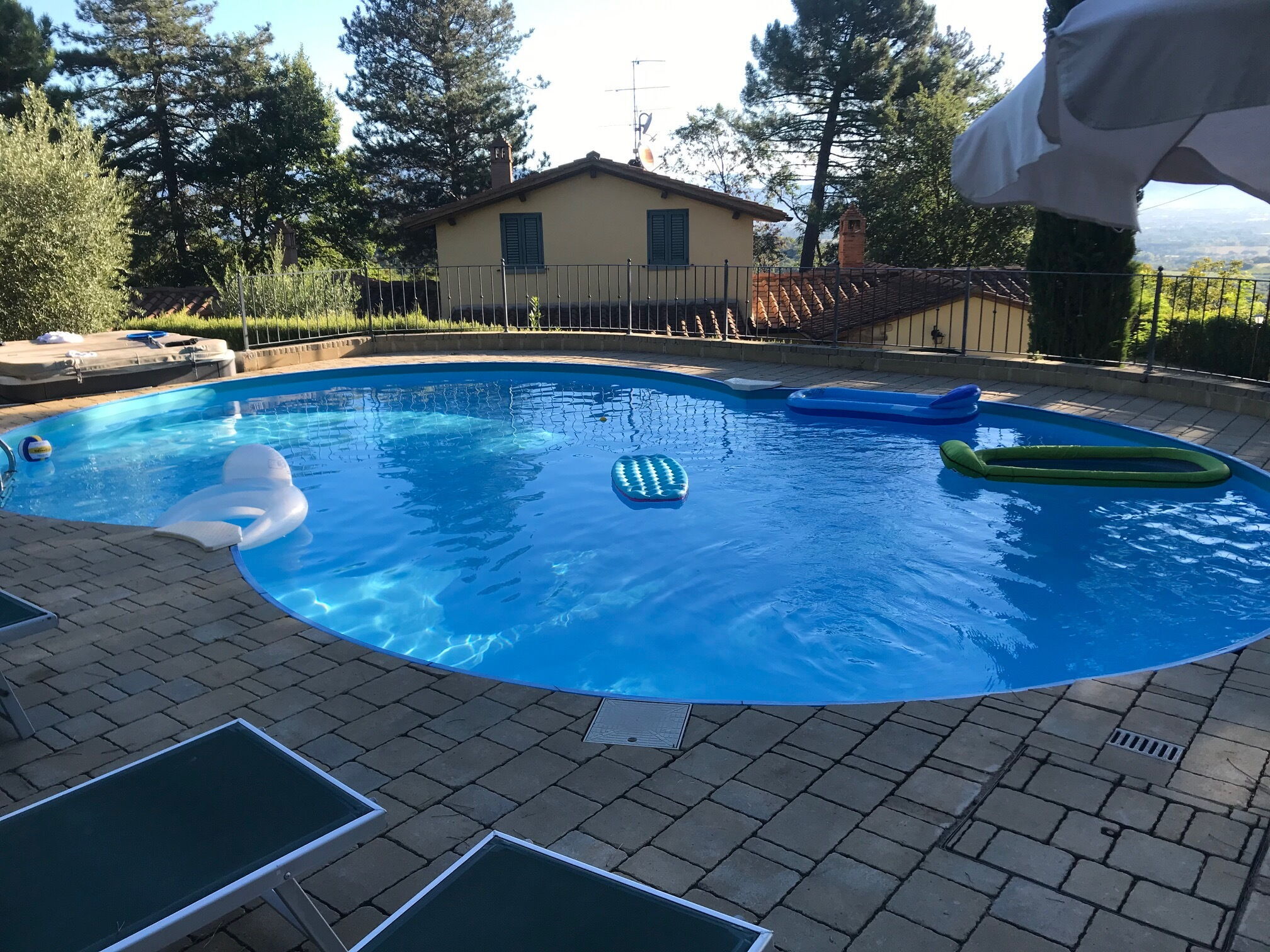 [English translation courtesy of Easy Reserve] Superb house / villa with pool, hot tub and city / countryside views. Very lovingly furnished. Everything available from glasses to dishwasher, washing machine, stove, a total of 3 kitchens, 3 separate units (house 2 and 3 connected by a lockable door). Almost solitary house on a hill near Arezzo. The first approach turned out to be an experience as we took the wrong route. Therefore read the directions carefully, then you will arrive immediately. Had a wonderful vacation. Day trips to Florence, Pisa, Rome, Chinque Terre are quite possible. But relaxing by the pool or strolling through Arezzo is also a nice change. The landlords are very nice and are happy to provide information. We locked ourselves out one evening when they even came at half past eleven and unlocked us. On Saturday they brought us a cake and a liqueur - really nice. They cleaned the pool regularly during our stay. At the beginning there was a welcome basket with various regional foods, masks and disinfectants. The house is very clean. There is nothing wrong with that. We will definitely spend the vacation there again. At the end we wanted to give a tip, which they declined with thanks and said we should buy something else on our way home. The holiday home really looks like the pictures. It is just really worth 5 stars.