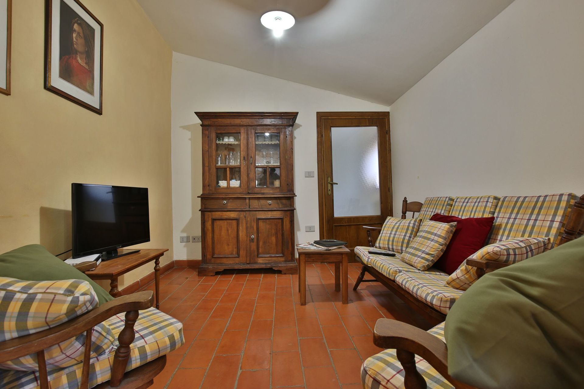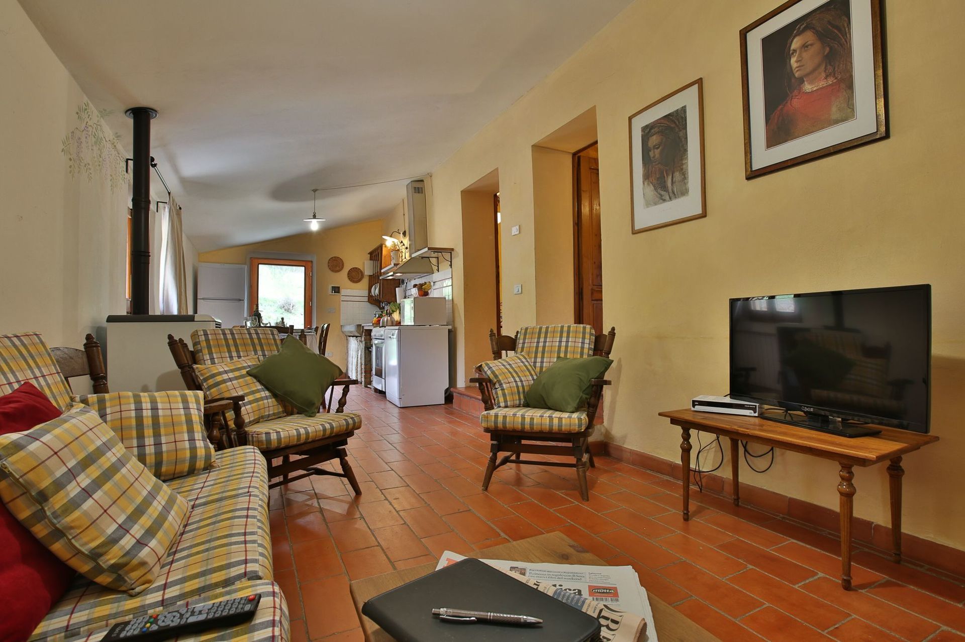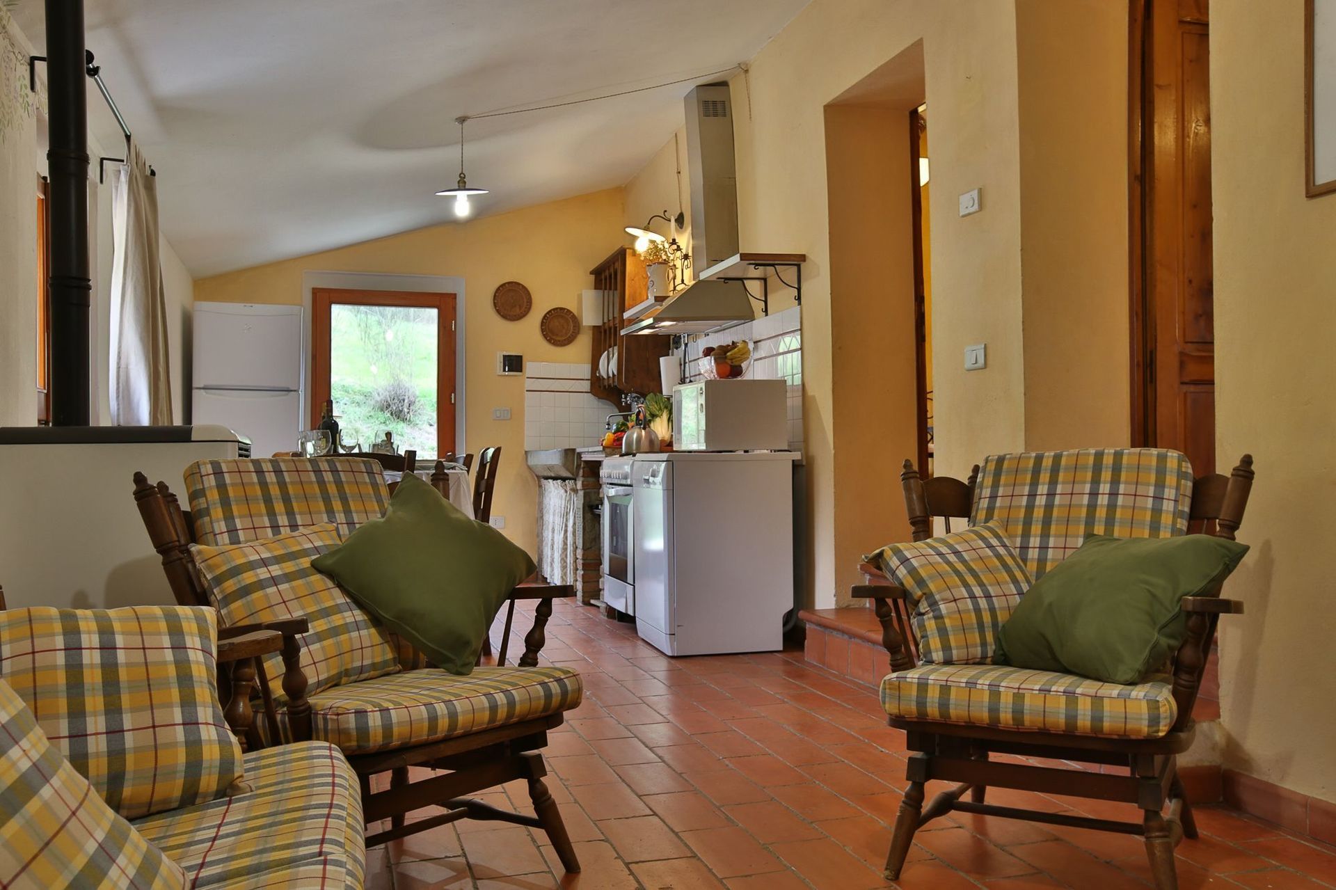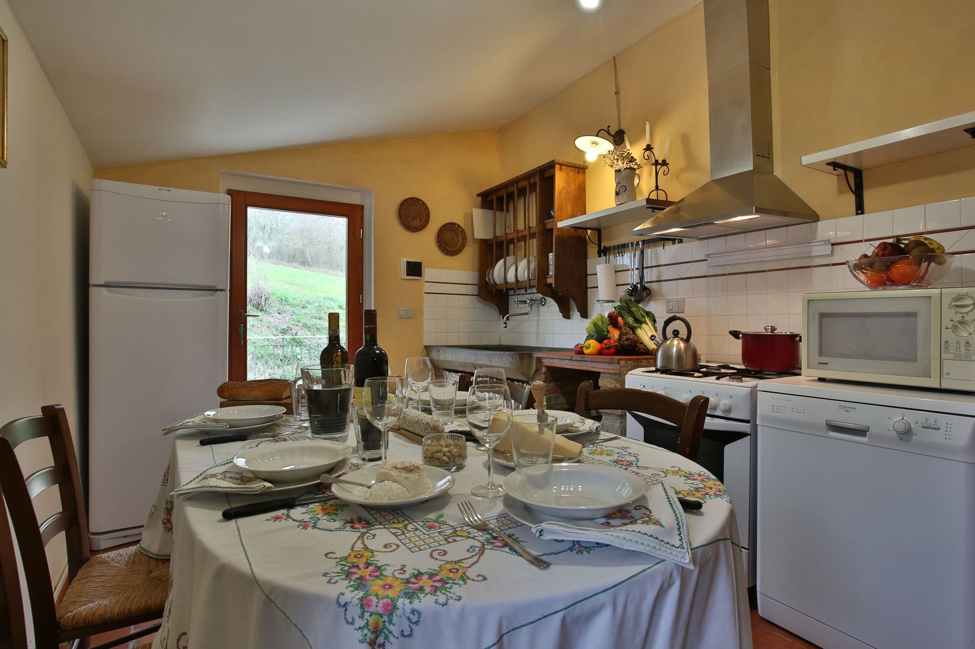 The kitchen has a really old stone sink, it has all kind of cooking stuff and equipped with a big fridge/freezer, cooker and oven, microwave, dish washer and coffee machine. The table is in wood and it’s big enough to accommodate till 5 people.