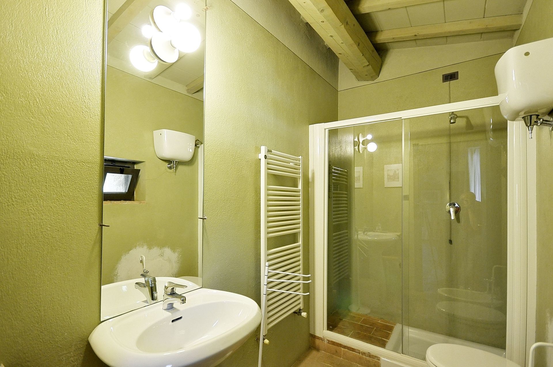 Rez-de-chaussée: entrée sur un grand séjour/salle à manger divisé en deux par un arc en maçonnerie (grande table en bois dans la zone repas), cuisine ouverte sur la zone repas (plan di cuisson-4 feux gaz, four électrique, grille-pain, frigo, freezer), WC (lave-mains), 2 chambres avec 2 lits à une place (peuvent être unis sur demande), accès de l’extérieur et salle de bains privée avec douche, une chambre avec 2 lits à une place et demie, accès de l’extérieur et salle de bains privée avec douche.