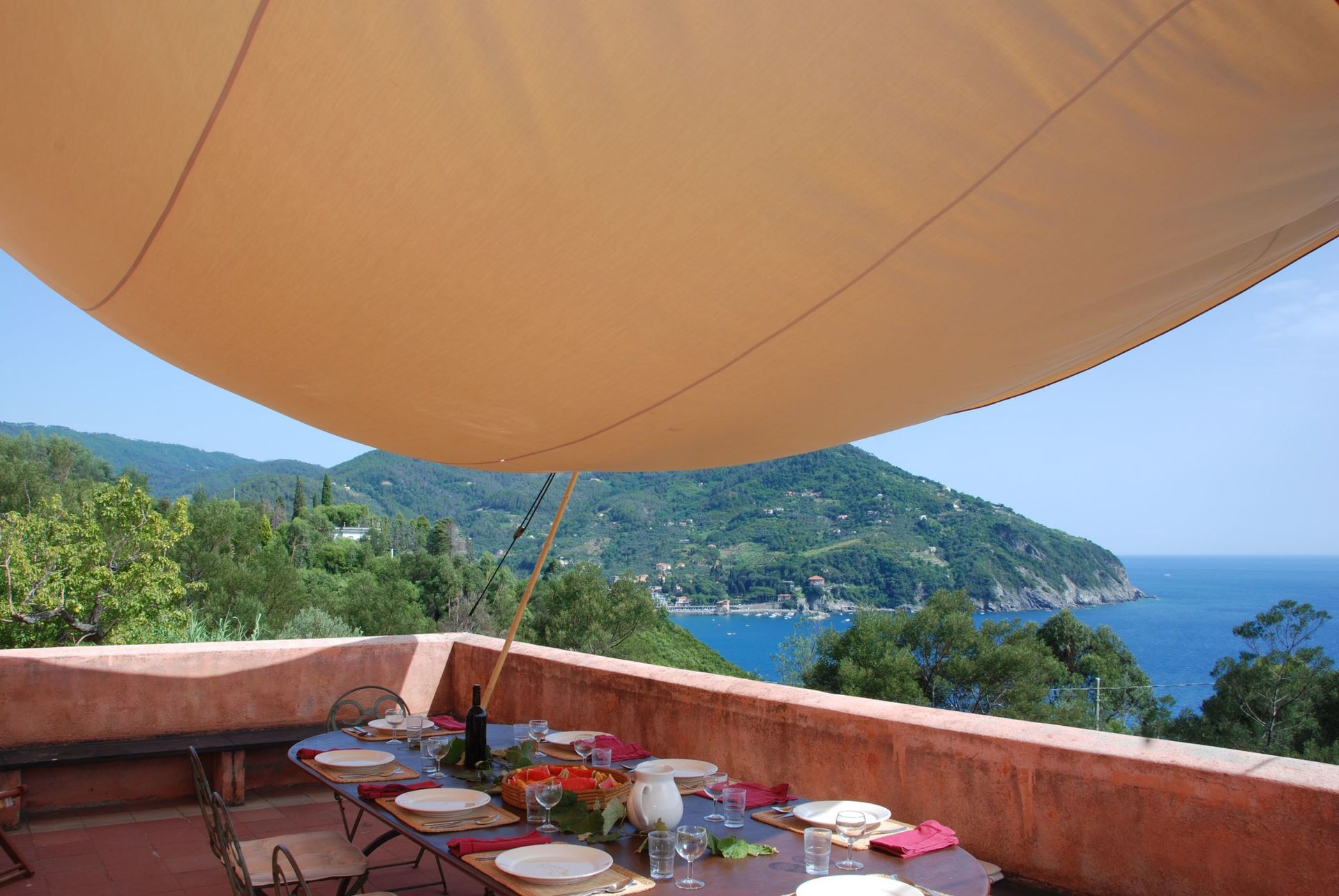 Une particularité de cette maison est la grande terrasse ensoleillée, meublée pour prendre ses repas en plein air, avec une vue splendide sur le Golfe de Levanto.