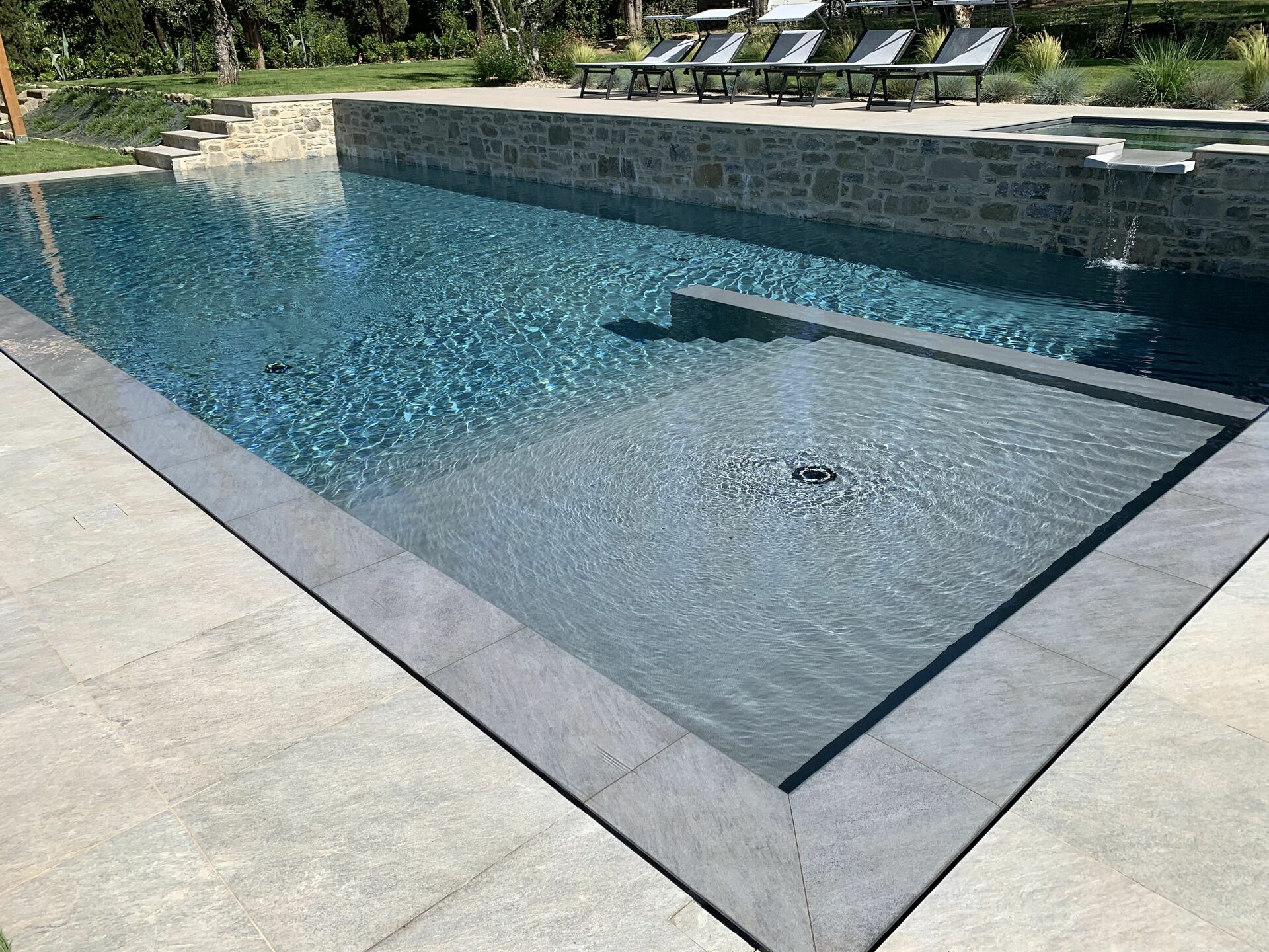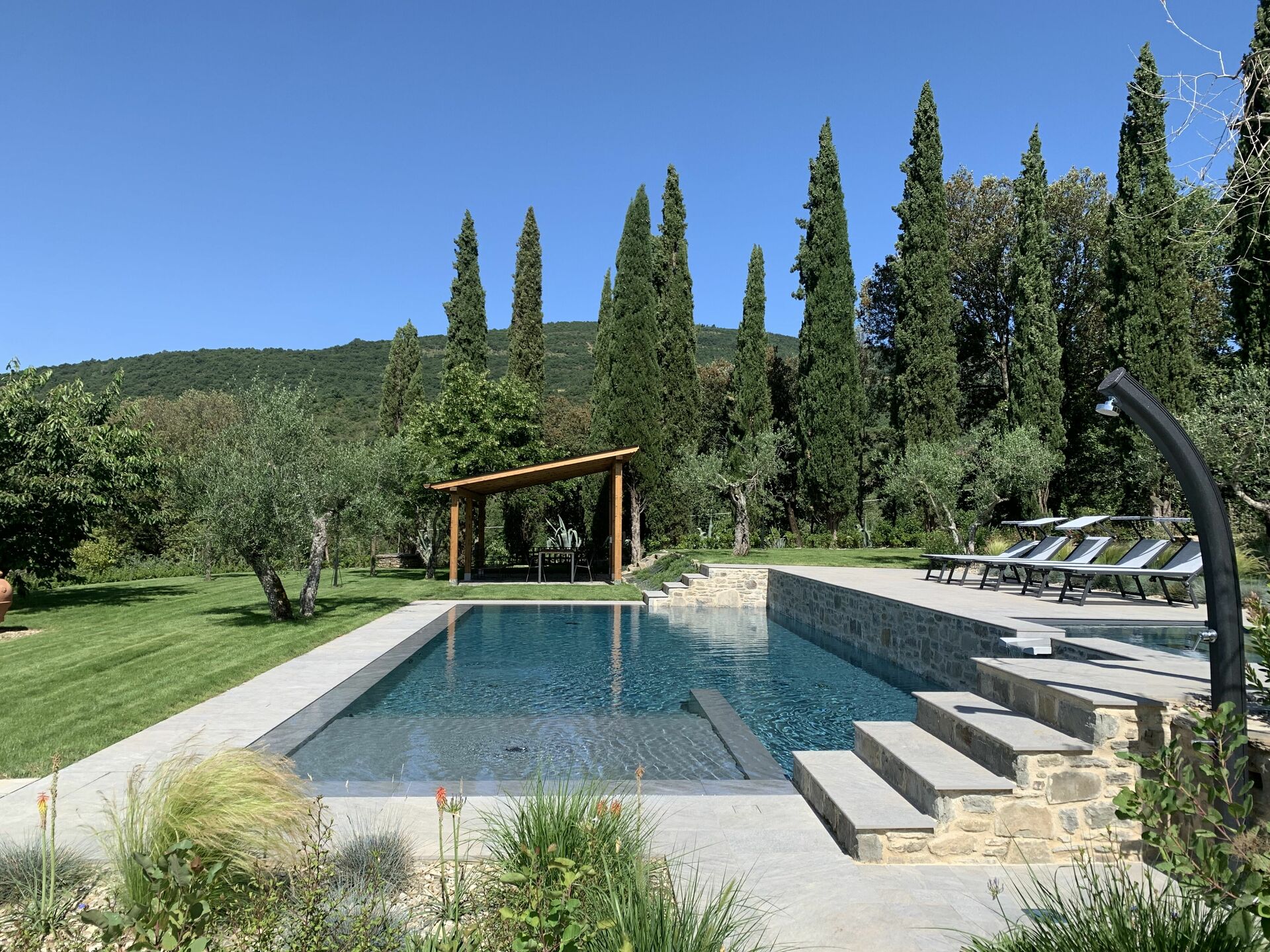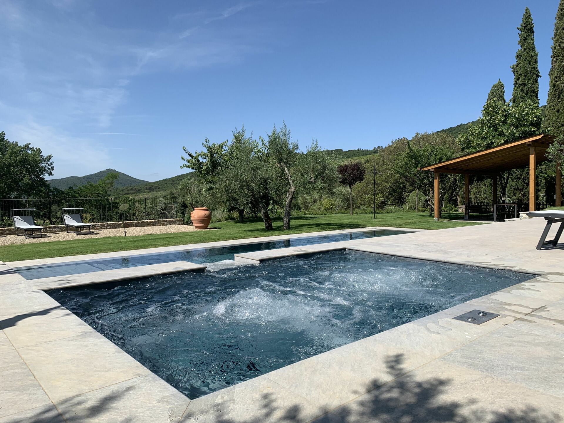 jardin: piscine (privé, largeur: 6m, longueur: 12m, profondeur max.: 2m, profondeur min.: 1.2m, en plein air), espace extérieur pour les repas en plein air, table à manger (personnes: 6), pavillon, meuble de jardin, meuble de terrace, dix chaises longues, clôturé /clôturée, propriété clôturée, aire de jeux pour les enfants.