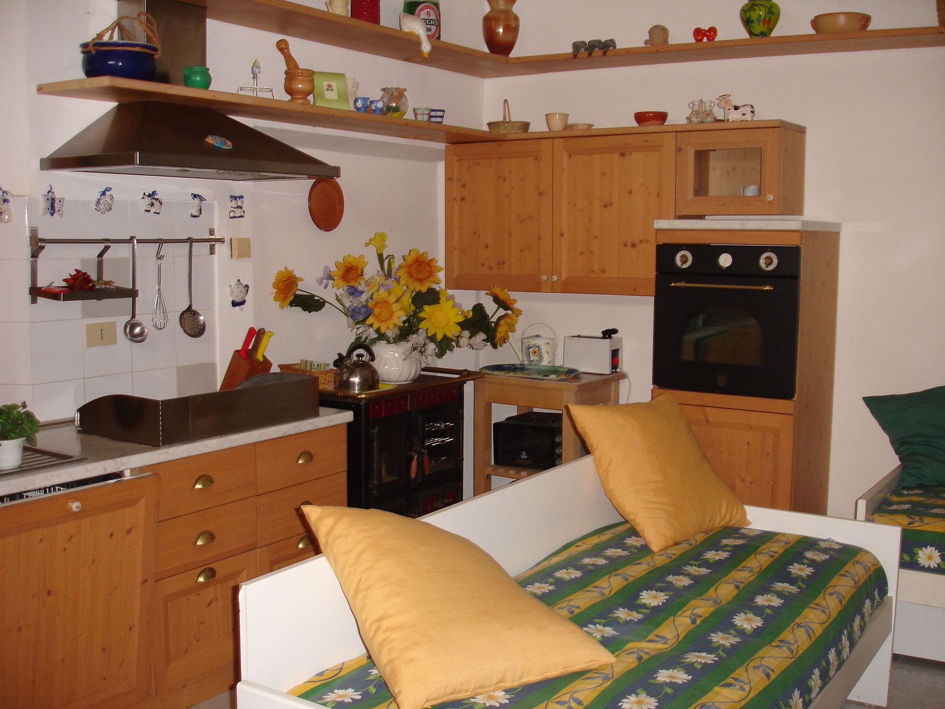 Cuisine – salle de séjour: table à manger, lave-vaisselle, réfrigérateur, cuisinière, four, deux canapés-lit, tv satellitaire, sortie sur le jardin.