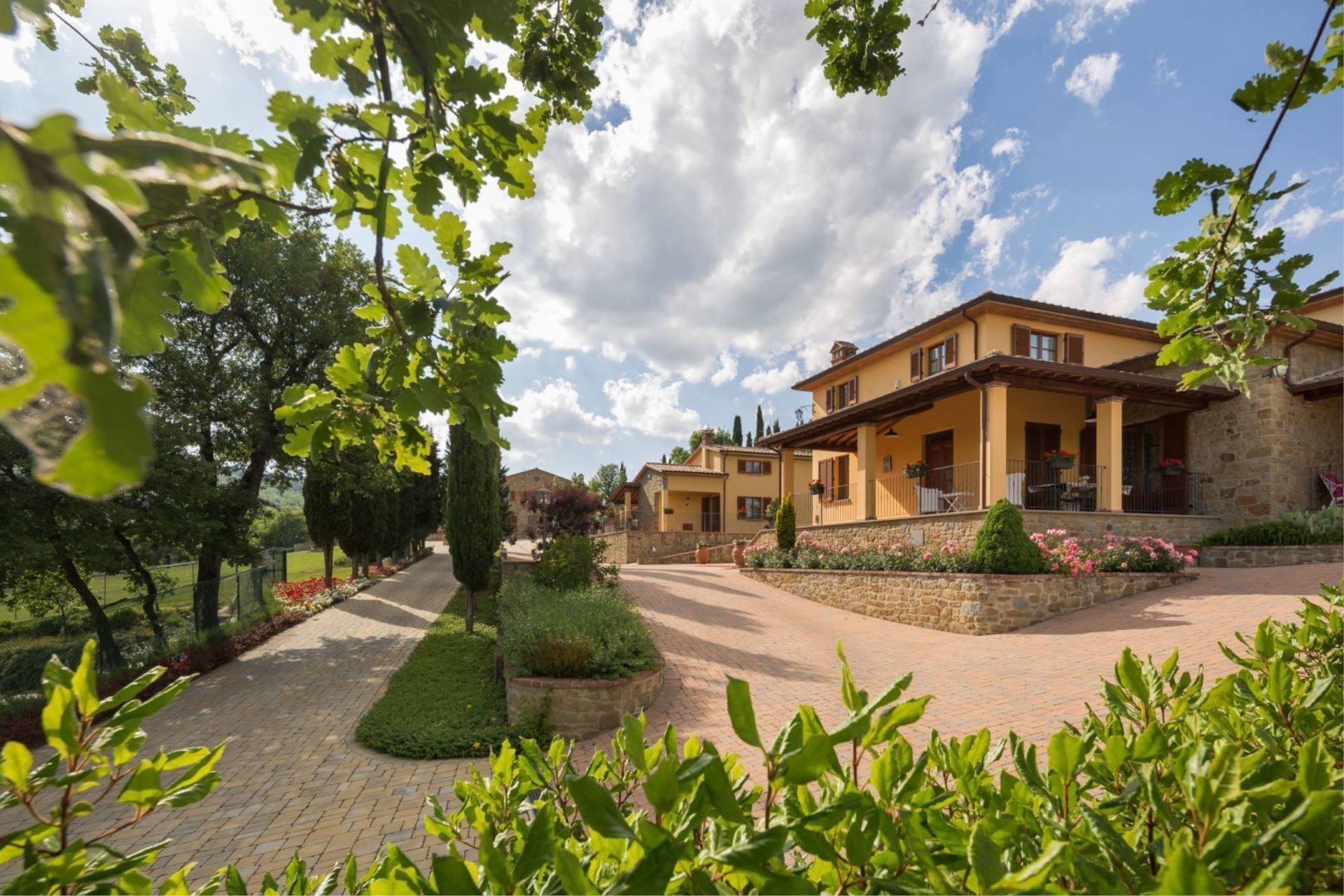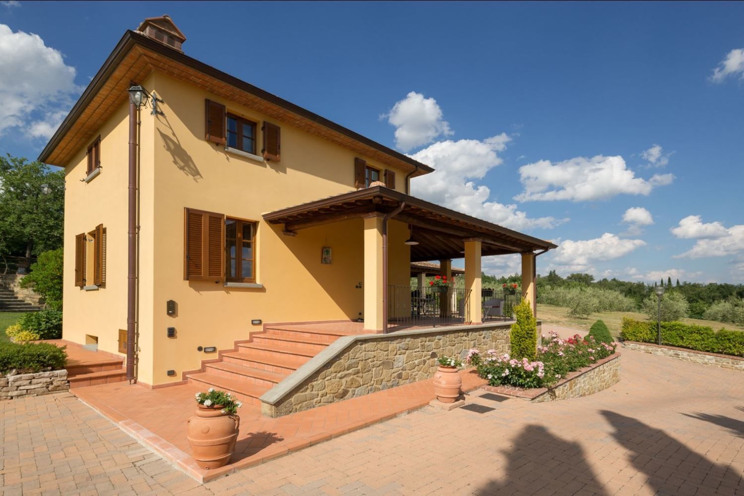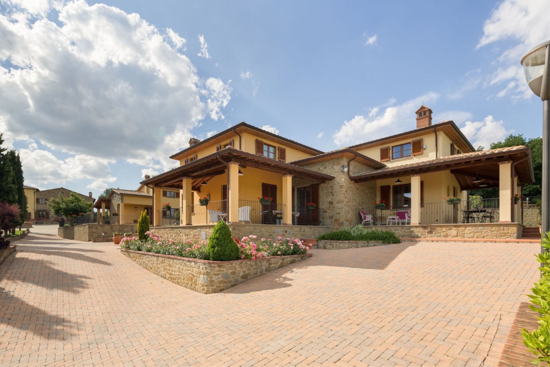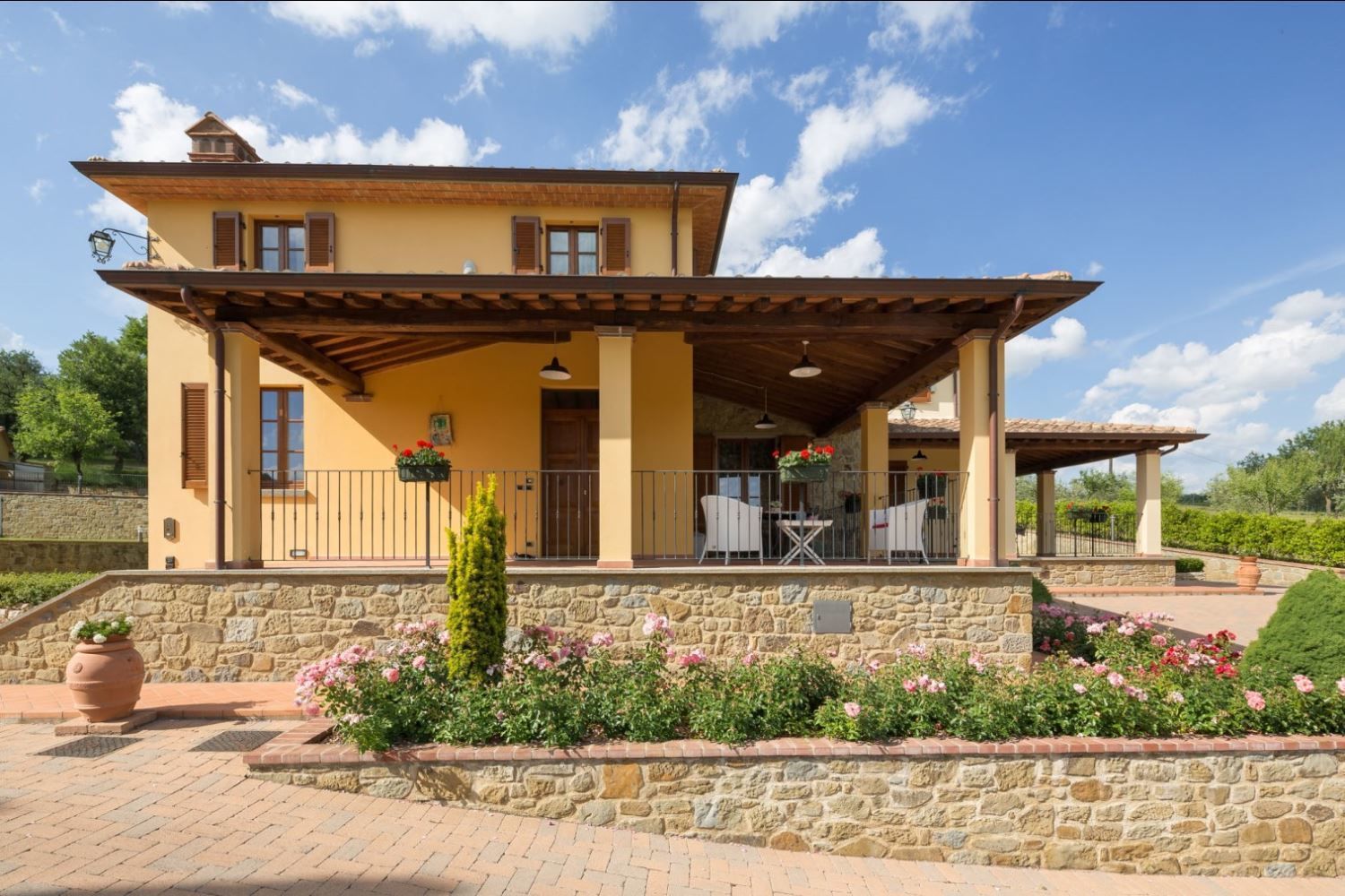Appartement sur deux niveaux avec accès par un portique privé équipé avec table et chaises pour manger en plein air.