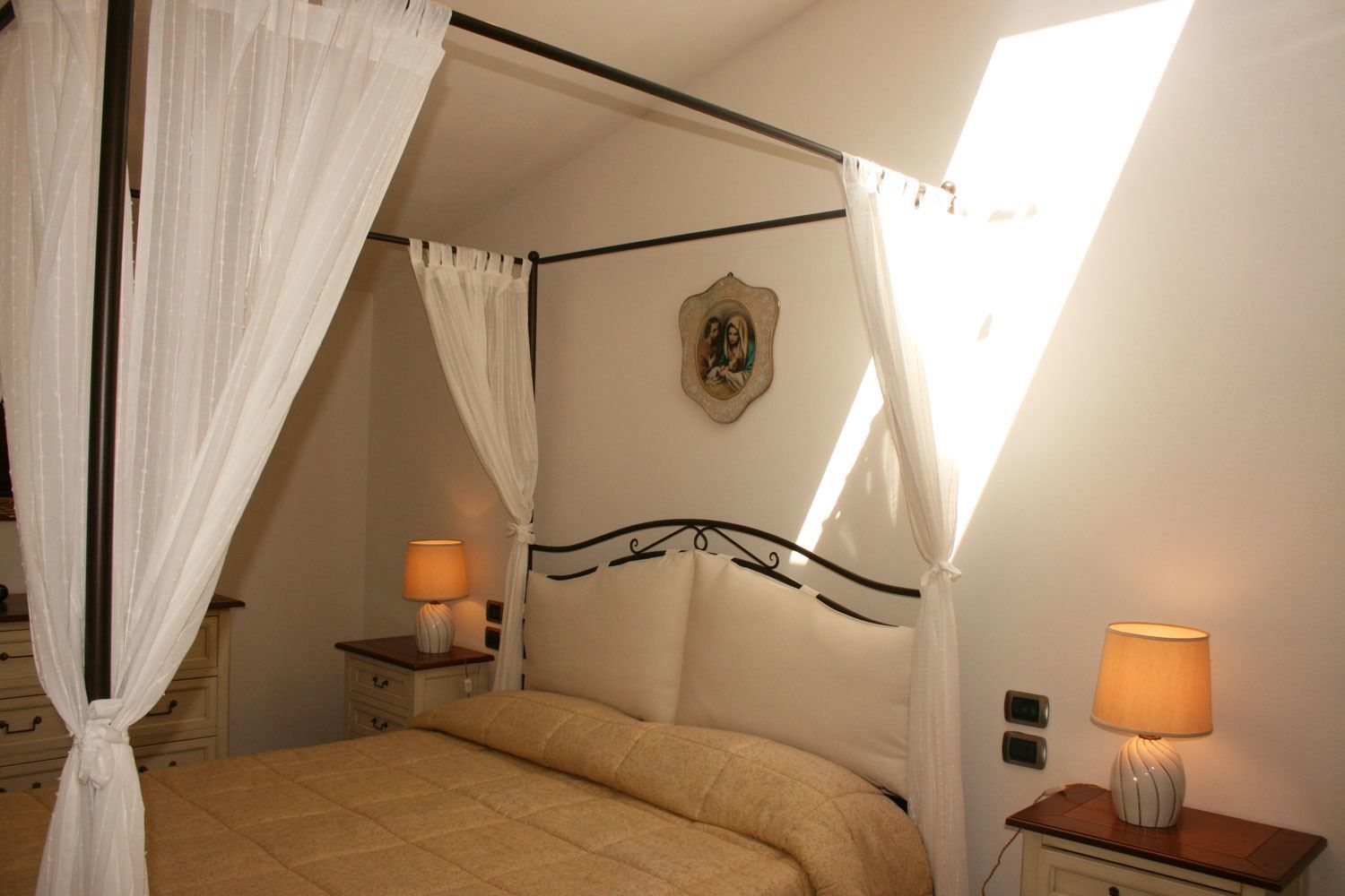 PREMIER ETAGE: Chambre avec deux lits individuels, cambre matrimoniale avec lit à baldaquin, salle de bains avec douche et débarras. Buanderie au sous-sol avec entrée par un escalier interne.