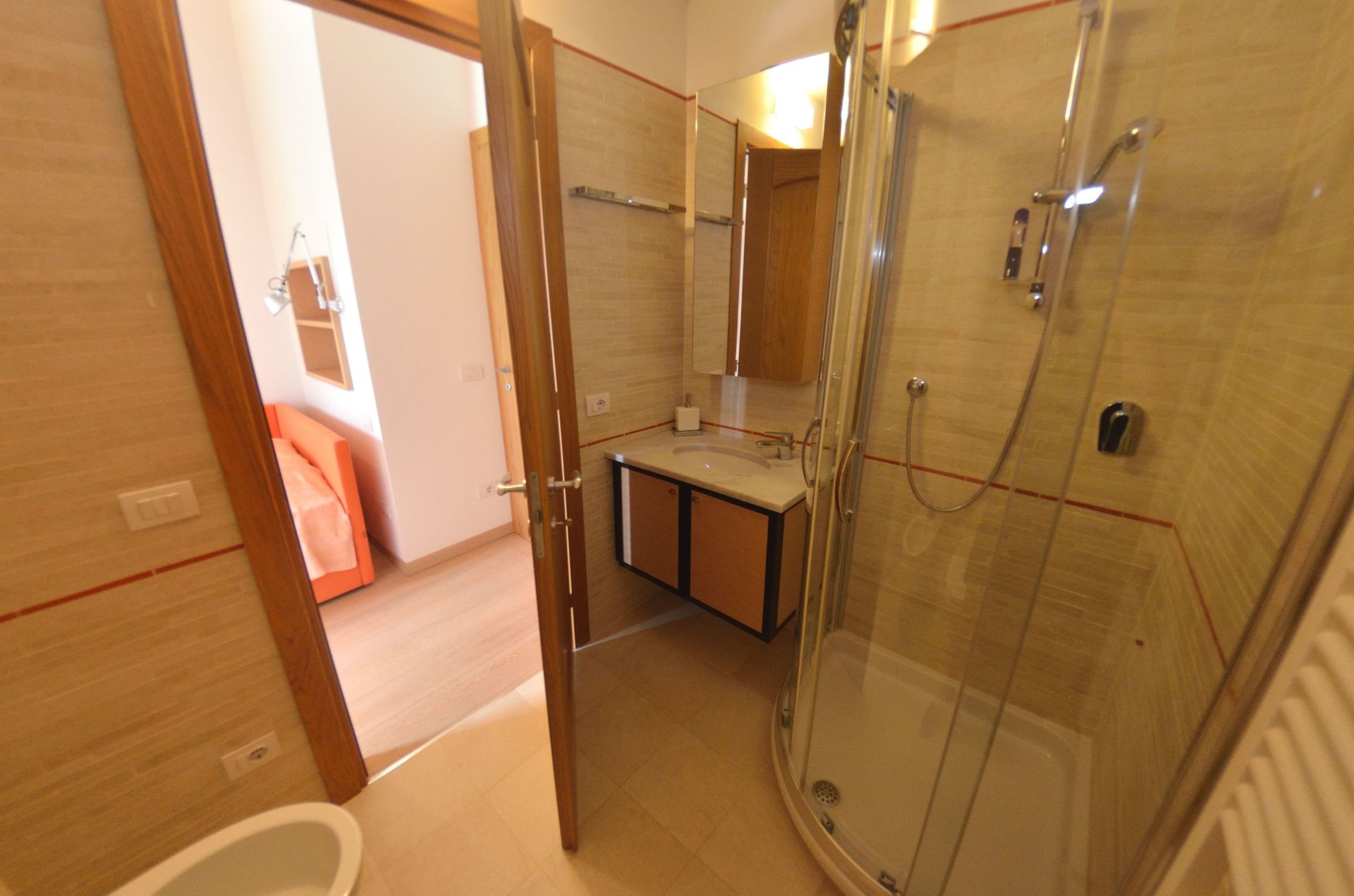 chambre avec salle de bain 1: lit à la française (140 cm) (largeur: 1.2m), canapé-lit, bassin, wc, douche.