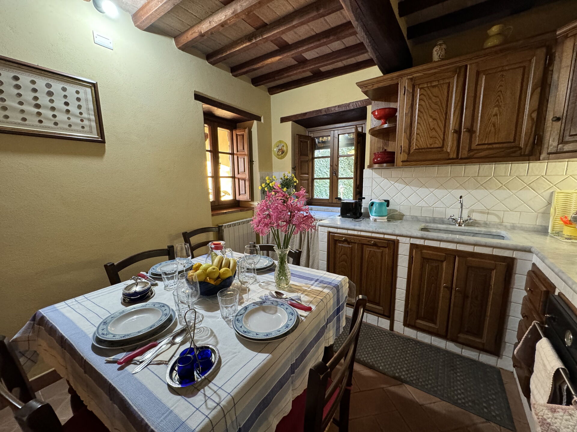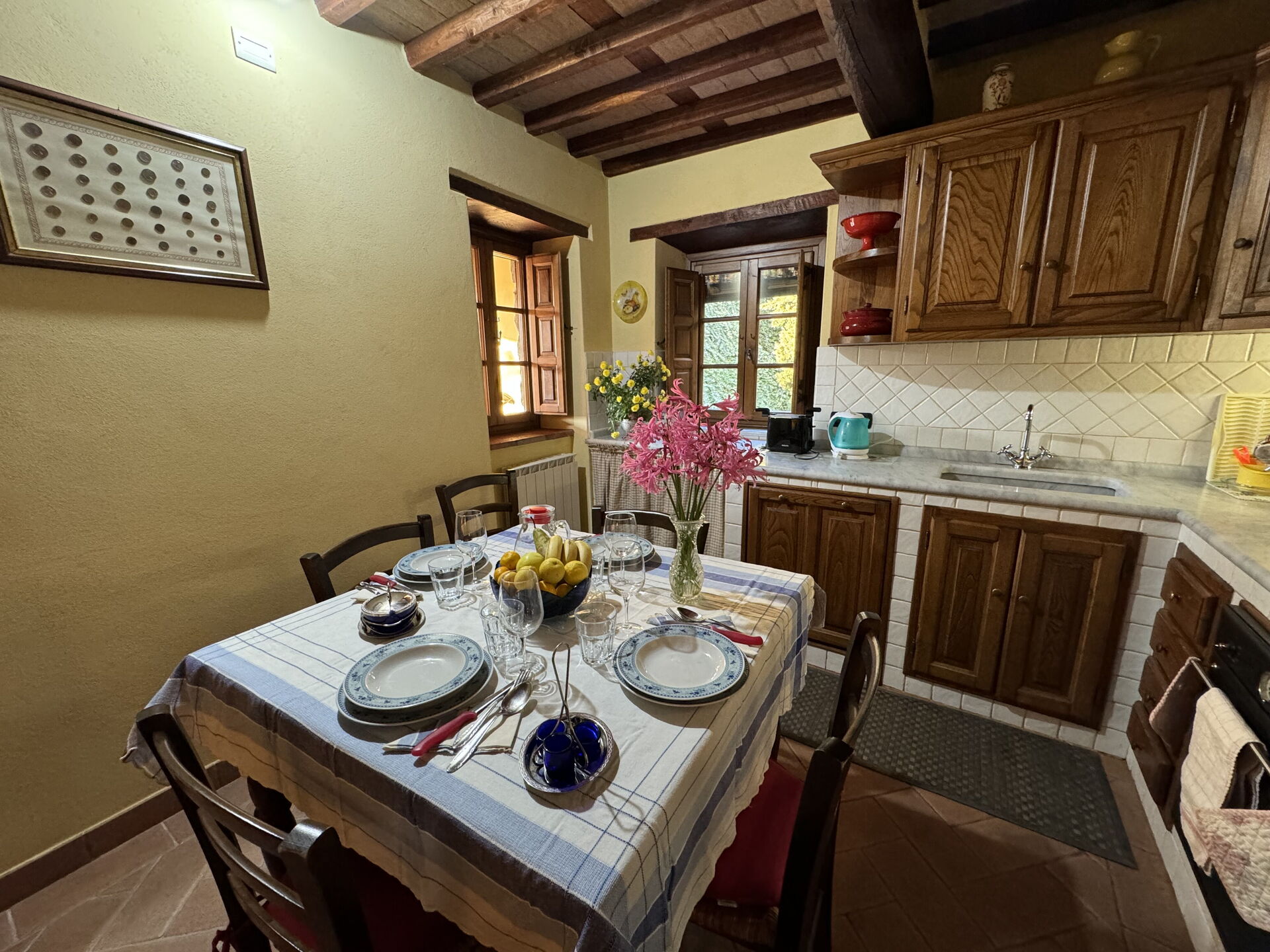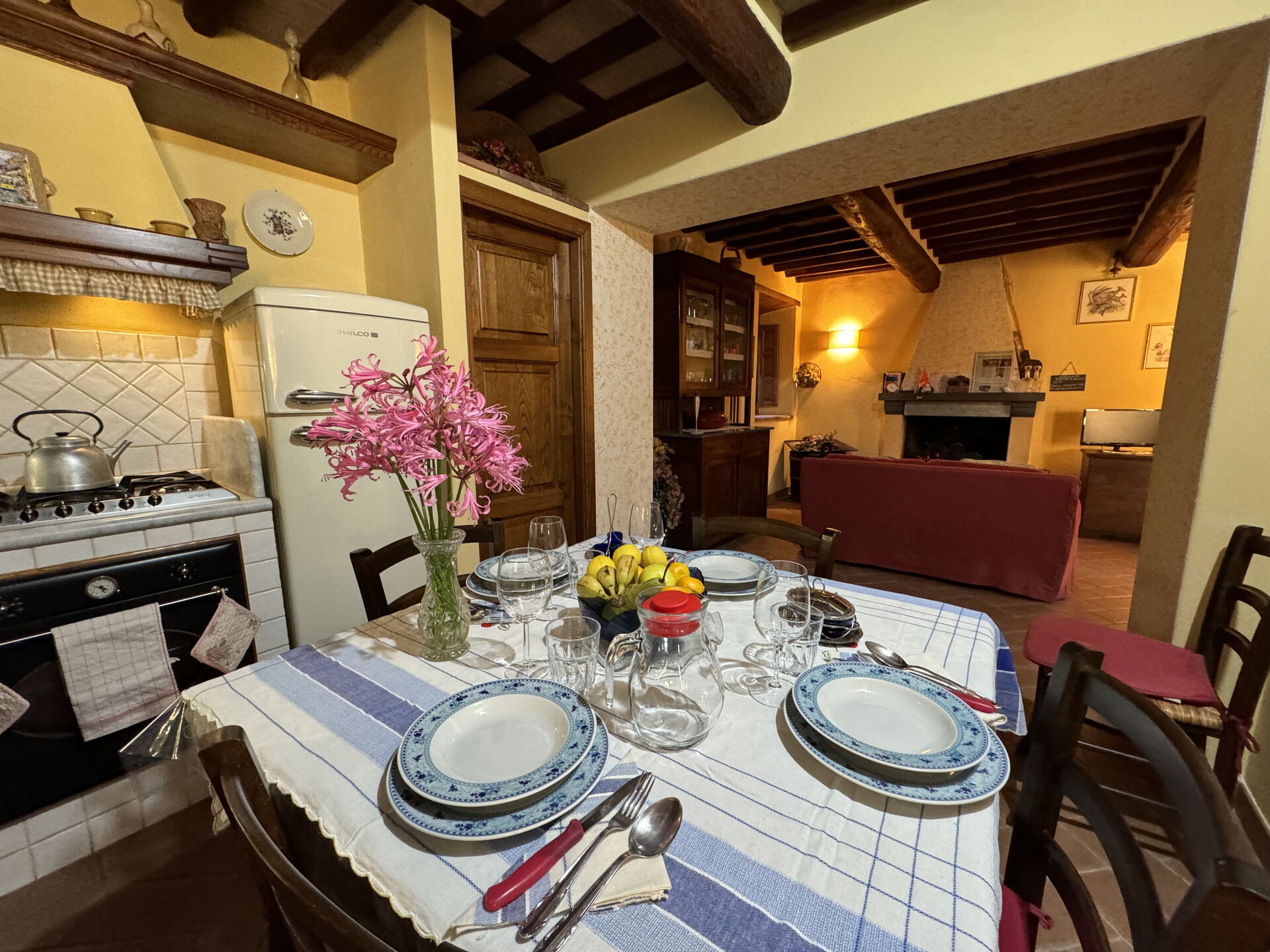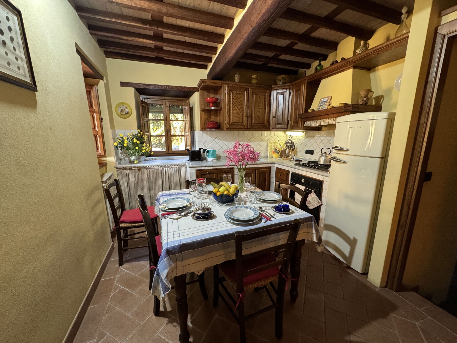 à l'arrivée à Batticapo di Ilaria vous trouverez une jolie propriété, propre et bien entretenue, avec vue sur les collines idéale pour des relaxantes vacances en Toscane. Peu importe comment vous passez vos journées... visites de musées, visites, shopping ou tout simplement en vous baladant à la campagne, quand vous arrivez à la maison, vous pouvez vous détendre à la piscine avec votre famille et vos amis et conclure au mieux un autre jour de vacances en Toscane. Il y a une cuisine y compris machine à café, cuisinière et réfrigérateur, ainsi que, assez de vaisselle et couverts jusqu'à six personnes. Si vous préférez dîner «al fresco», il y a à votre disposition un jardin où vous pourrez profiter du beau temps tout en mangeant en plein air.
