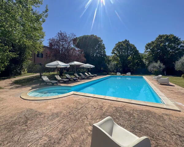 Les espaces extérieurs de la Villa « Paolotti » sont pensés avec soin pour compléter la beauté naturelle du paysage ombrien environnant. Le jardin privé, entièrement clôturé, offre un environnement sûr et tranquille où vous pouvez profiter de l'air frais de la campagne en toute intimité. Au cœur de l'espace extérieur se trouve la piscine, mesurant un impressionnant 14 x 6 mètres avec une profondeur de 145 cm, disponible de manière saisonnière du 25 mai au 30 septembre, offrant le cadre parfait pour des baignades rafraîchissantes lors des chaudes journées d'été. Une charmante pergola crée un refuge ombragé idéal pour les après-midi détente, tandis que le mobilier de jardin vous permet de dîner, vous relaxer et socialiser confortablement sous le ciel ouvert. Un barbecue est également disponible, vous offrant la possibilité de préparer et de savourer des repas en plein air tout en profitant des vues sereines de la campagne ombrienne.