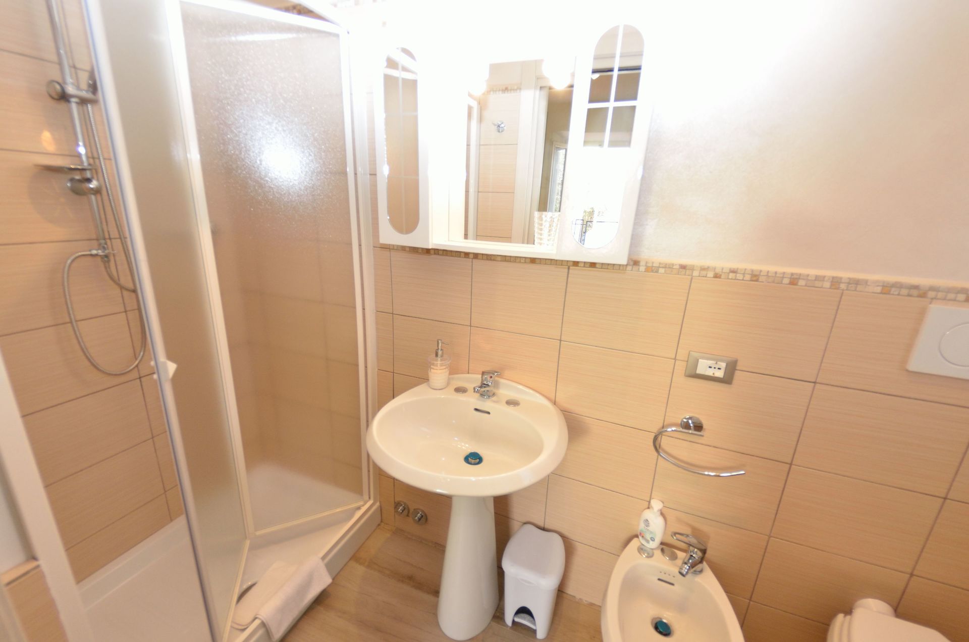 salle de bain: bassin, wc, bidet, douche.