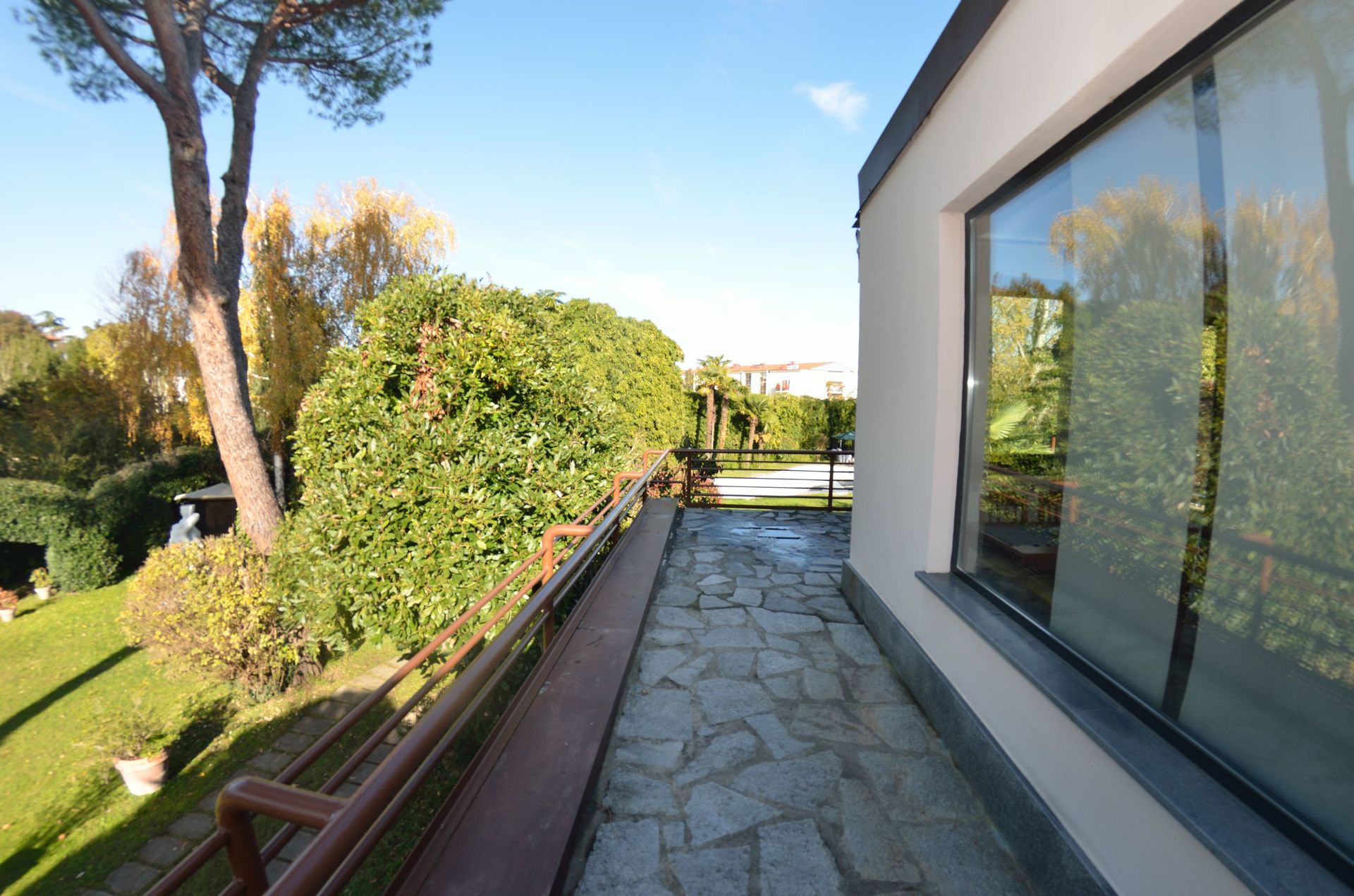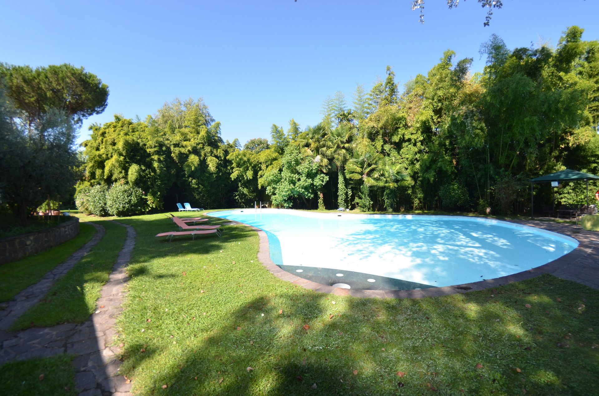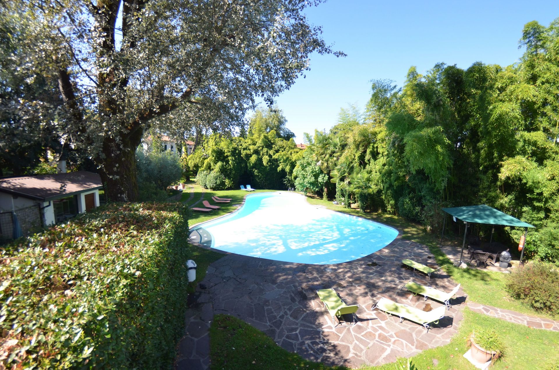 jardin: piscine (largeur: 8m, longueur: 21m), meuble de jardin.