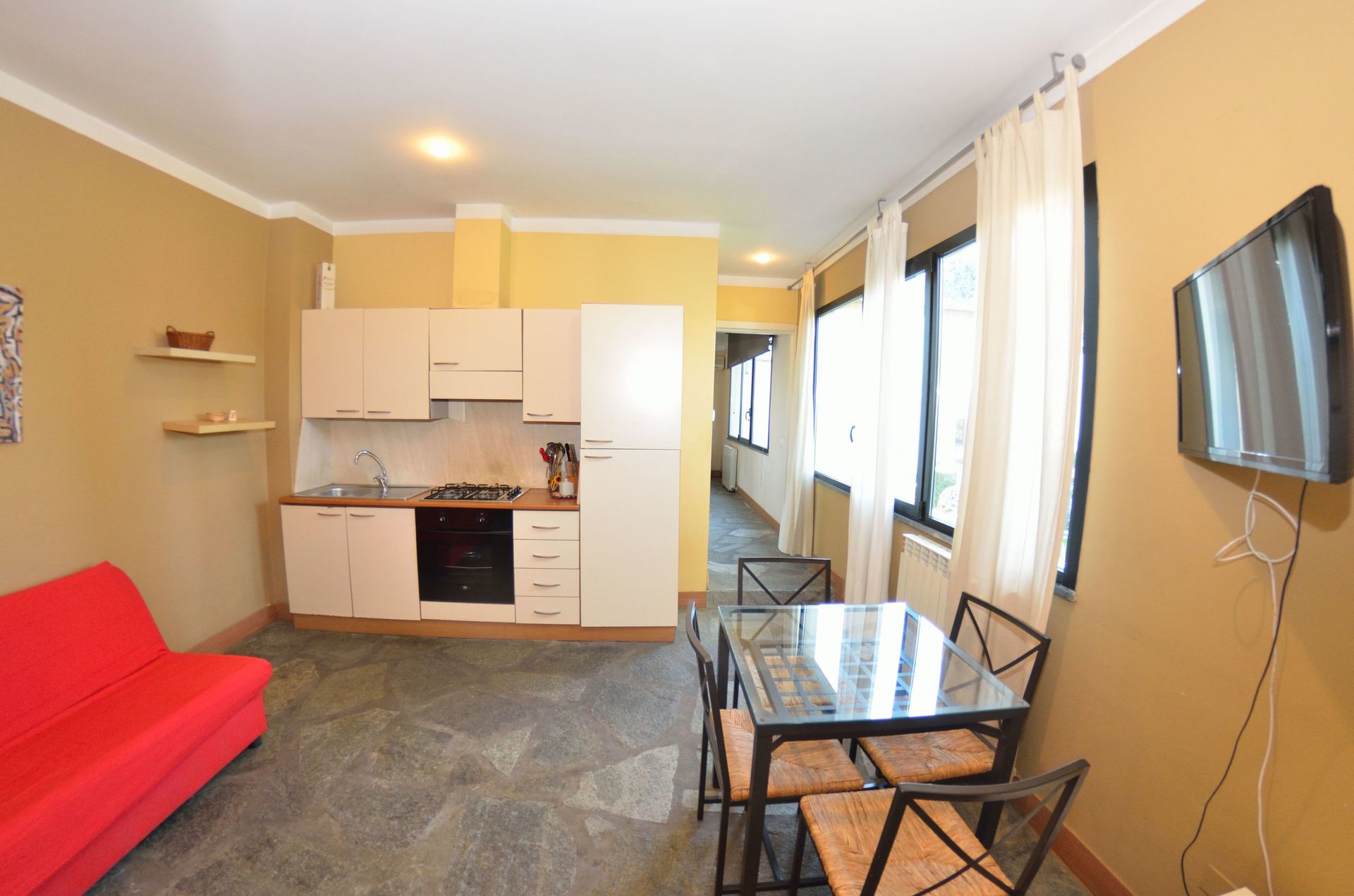 Cuisine – salle de séjour: table à manger (personnes: 4), réfrigérateur, cuisinière, canapé, sortie sur la terrasse.
