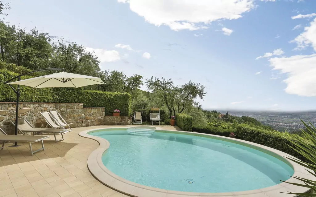 Maison individuelle individuelle "Villa I Cipressi", 400 m au dessus du niveau de la mer. Dans le hameau de Montaccolle. À 6 km du centre de Montecatini Terme, à 16 km du centre de Pistoia, à 56 km du centre de Firenze, situation tranquille sur une colline, à 60 km de la mer. A usage privé: terrain 4'500 m2 (clôturé), jardin sur plusieurs niveaux entretenu, pelouse, piscine en forme d’haricot (30 m2, profondeur 110 - 150 cm, disponibilité saisonnière: 15.Mar. - 15.Oct.). Douche extérieure. Accès en voiture par un chemin étroite de 100 m de long. Place de parking sur le terrain. Magasins 6 km, arrêt de bus 7 km, gare ferroviaire "Montecatini Terme" 8 km, plage de sable "Lido di Camaiore" 60 km. Terrain de golf (18 trous) 15 km.