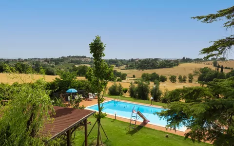 Maison "San Piero". À 1.5 km du centre de Foiano della Chiana, à 20 km du centre de Cortona, à 25 km du centre d'Arezzo, situation isolée, à 25 km du lac, dans la verdure. A usage privé: terrain 10'000 m2 (clôturé), jardin naturel, champ, cour, piscine (12 x 6 m, profondeur 120 - 240 cm, disponibilité saisonnière: 15.Mai. - 25.Sep.) avec systeme d'électolyseur au sel. Douche/WC dans l'espace piscine, toboggan, terrasse, place de parking (pour 2 voitures, couvert). Arrêt de bus 1 km, gare ferroviaire "Castiglion Fiorentino" 15 km, baignade en lac "Lago Trasimeno" 25 km. Terrain de golf (9 trous) 10 km. Attractions à proximité: Castiglion Fiorentino 17 km, Monte San Savino 15 km, Cortona 22 km, Arezzo 35 km, Outlet Village Valdichiana 7 km. Veuillez noter: voiture recommandée.