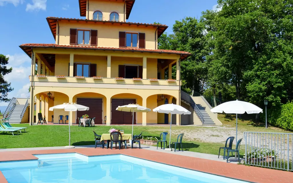 Grande maison de maître individuelle "Villa Le Castagne", 400 m au dessus du niveau de la mer. À 4 km du centre de San Baronto, à 15 km du centre de Pistoia, à 52 km du centre de Florenz, situation surélevée sur une colline, dans la verdure. A usage privé: terrain 4 ha, grand jardin entretenu (pas clôturé) avec pelouse et arbres, pré, piscine cloturée (10 x 5 m, profondeur 140 - 140 cm, disponibilité saisonnière: 10.Avr. - 09.Oct.) avec marches intérieures. Infrastructures de la Maison: possibilité de chauffage uniquement du 01.Nov. - 15.Avr. (en sus). Accès en voiture jusqu'à la maison par un chemin difficile de 500 m de long. Sentier en escalier jusqu'à la maison. Place de parking (pour 3 voitures) sur le terrain. Magasins 4 km, supermarché 5 km, arrêt de bus 6 km. Terrain de golf (18 trous) 5 km, tennis 5 km. Possibilité de réserver des cours de cuisine. Vente locale de produits de la ferme.