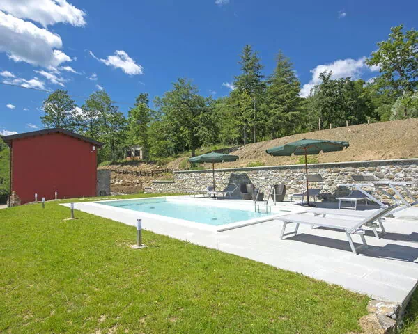 La piscine mesure 8 x 4 mètres avec une profondeur de 120 cm et est disponible de manière saisonnière du 15 mai au 30 septembre. Une douche extérieure est aménagée à proximité de la piscine. Le jardin est équipé de mobilier de jardin créant des espaces confortables pour se détendre, dîner en plein air ou profiter de l'atmosphère paisible de la campagne. Le vaste domaine partagé de 140 hectares comprend des sentiers de nature où les hôtes peuvent explorer et découvrir la faune et la flore typiques de la région.