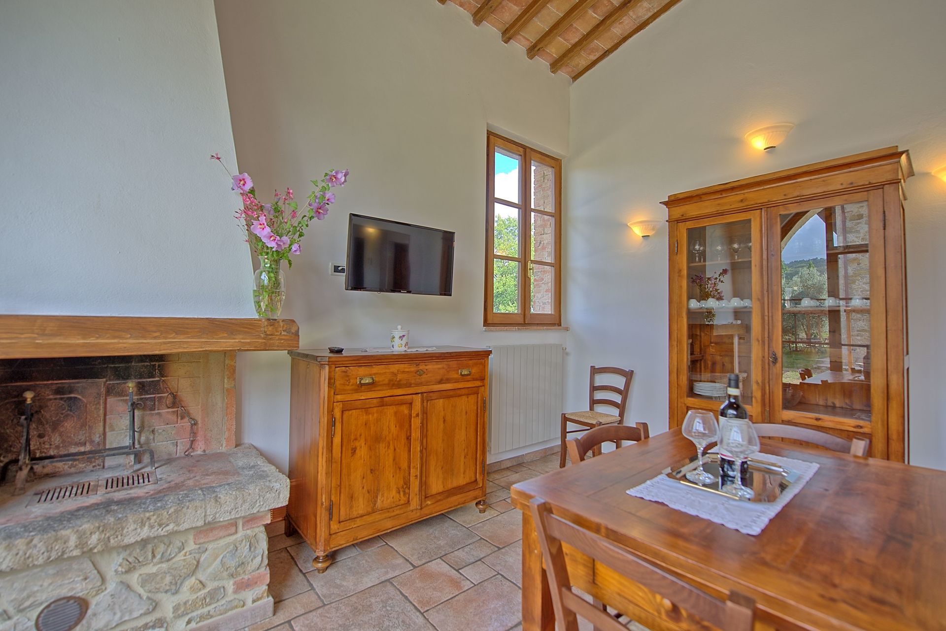 Rez-de-chaussée: Entrée du salon (TV) avec cheminée, coin repas et coin cuisine (congélateur, micro-ondes, lave-vaisselle), chambre à coucher avec un lit simple et salle de bain privée avec douche, chambre double, chambre à coucher avec un lit simple et accès à l'extérieur salle de bain avec douche.