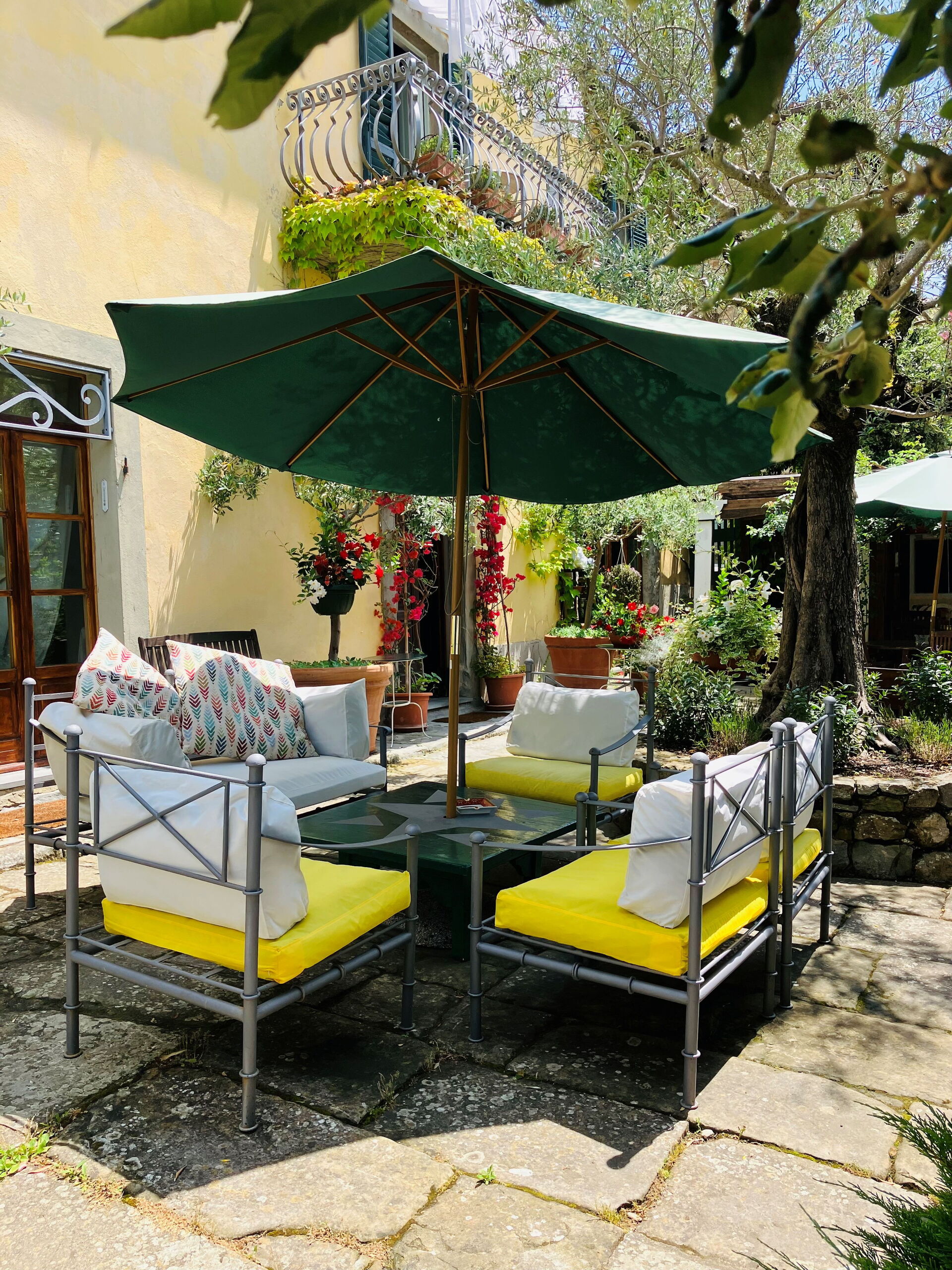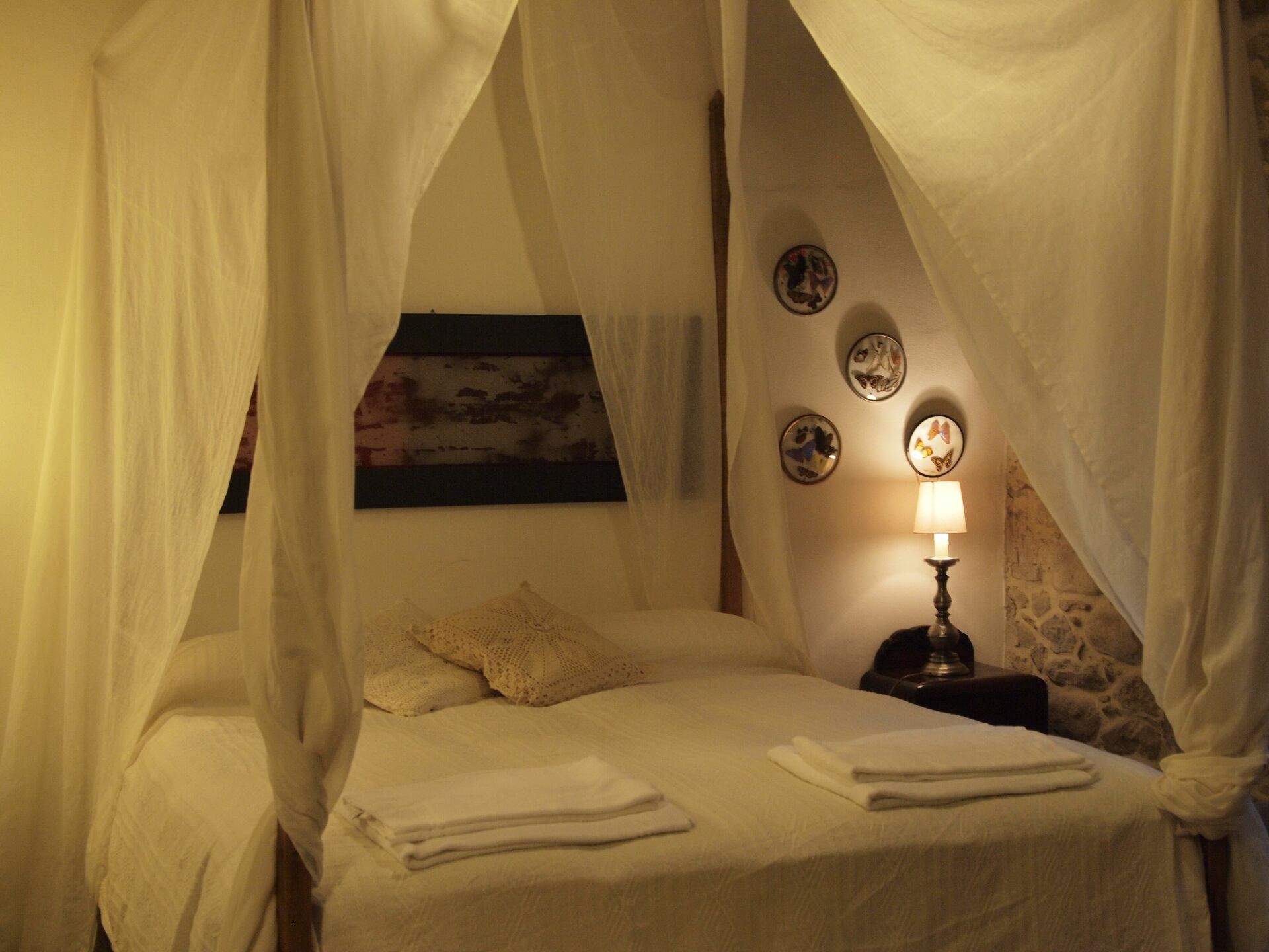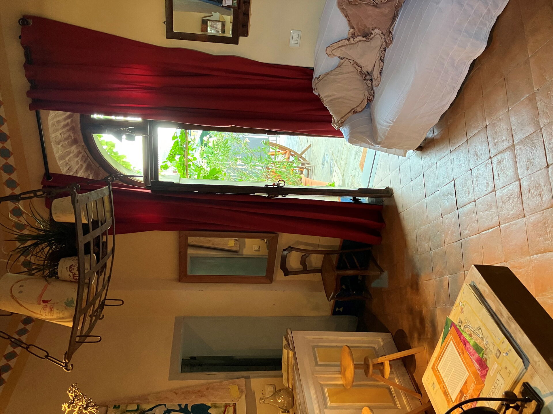 chambre avec salle de bain 1 (25 m2): lit double, internet WIFI, climatisation, ventilateur portable, fauteuil, bureau, cheminée, réfrigérateur, wc, bidet, douche, sèche-cheveux, sortie sur le patio.