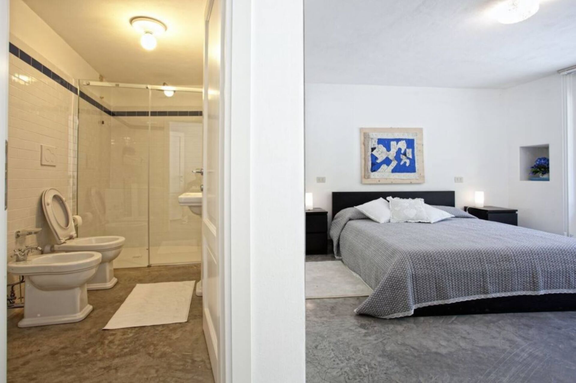 chambre avec salle de bain 1: lit double (largeur: 160m, longueur: 190m), internet WIFI, climatisation, moustiquaires, bassin, wc, bidet, douche, sèche-cheveux.