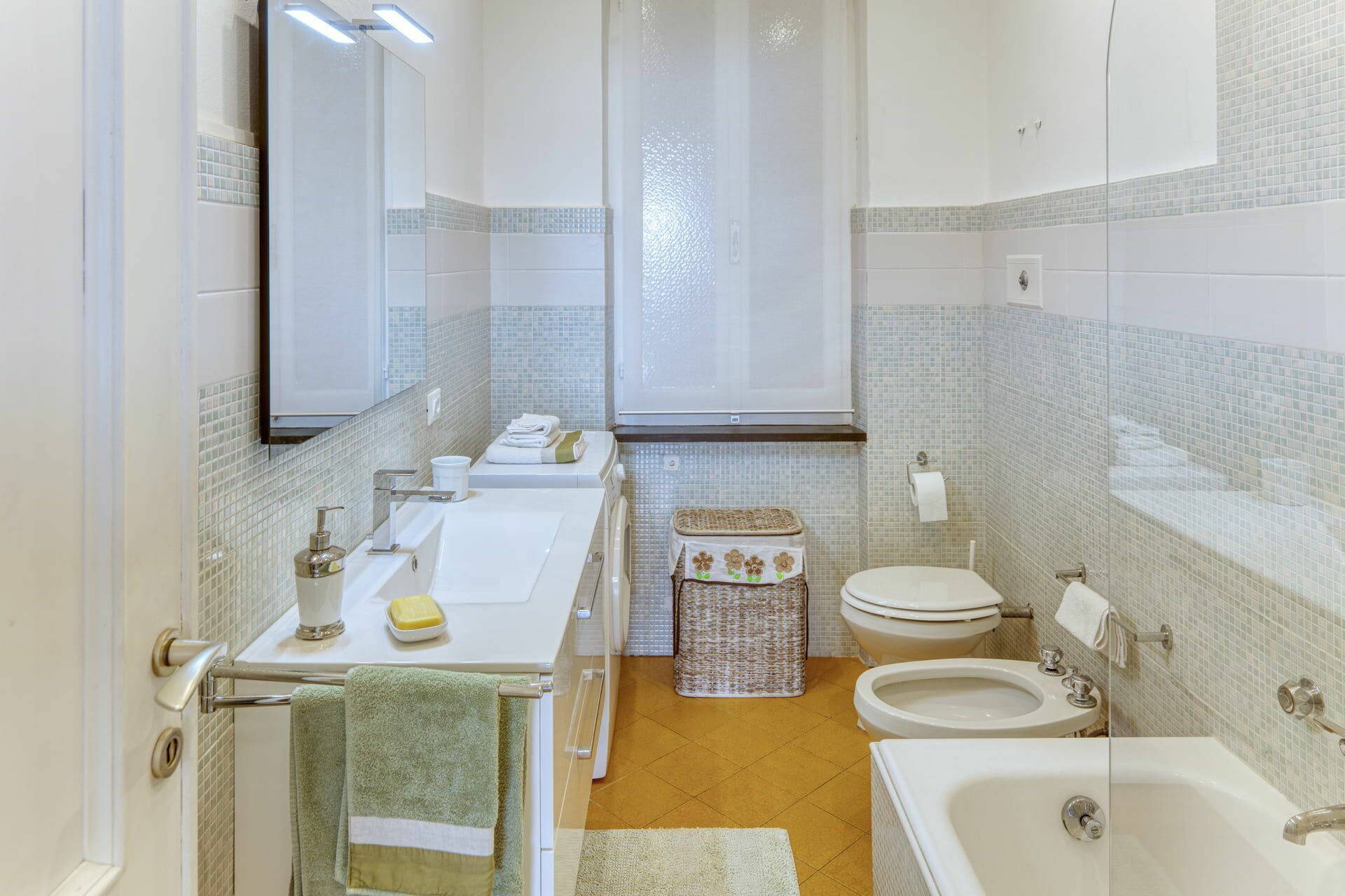 Salle de bain avec baignoire et machine à laver.