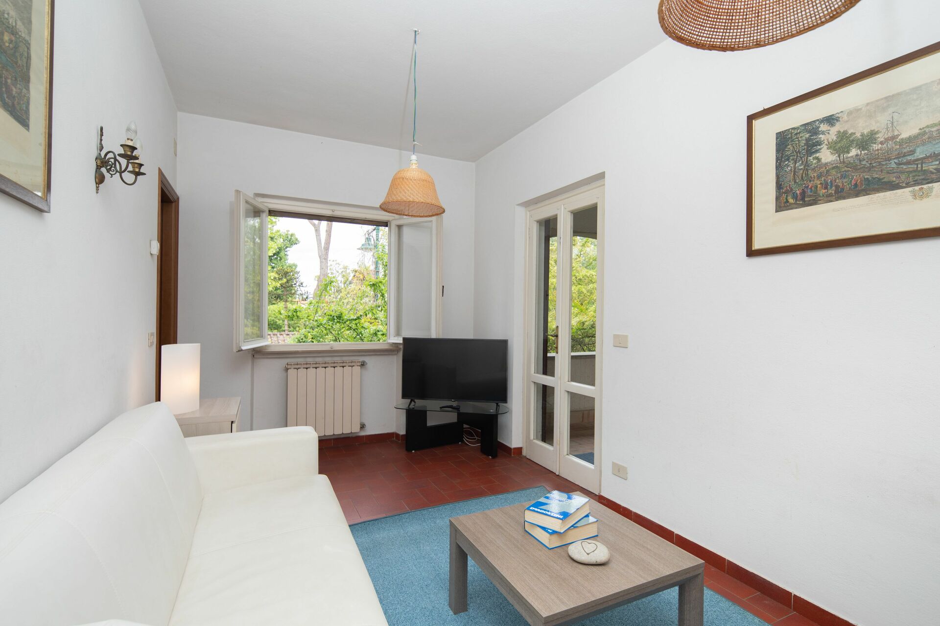 Salon: canapé, télévision, ventilateur portable, sortie sur la terrasse.