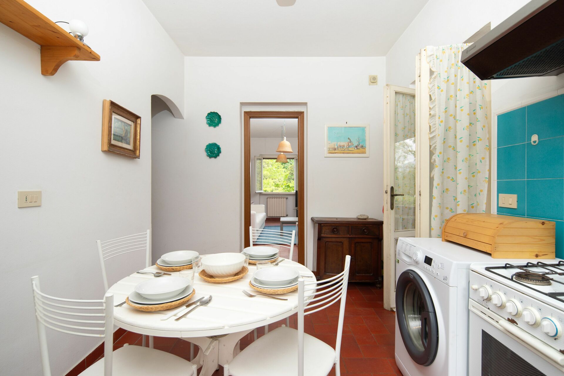 cuisine: cuisine bien équipée, table à manger, réfrigérateur, congélateur, cuisinière, four, lave-linge.