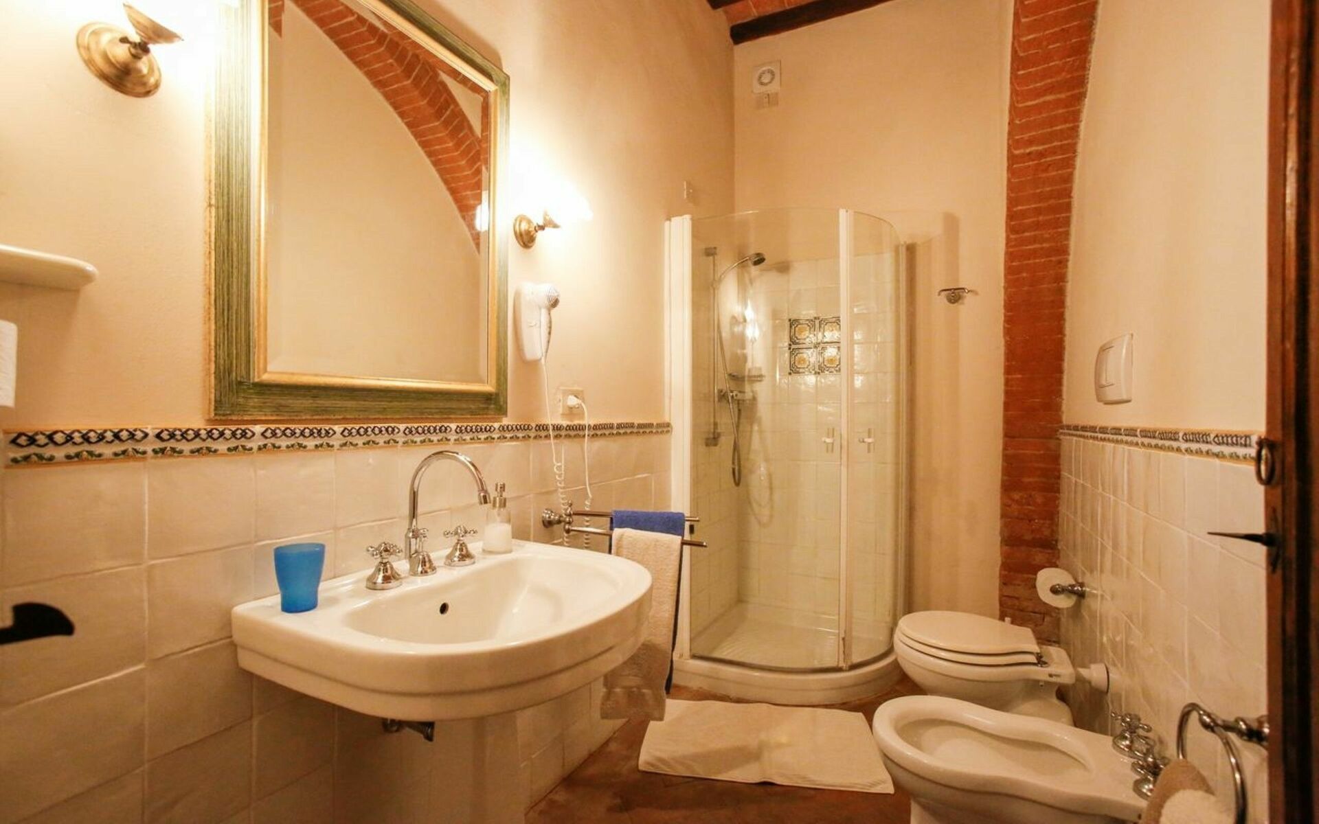 salle de bain: bassin, wc, bidet, douche, sèche-cheveux.