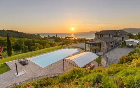 Belle villa luxueuse, individuelle "Trasimena", environnée par les champs. Location composée d'un bâtiment principal et d'une annexe, à 3 km du centre de Magione, à 7 km du centre de San Feliciano, sur une colline, à 1 km du lac, dans une impasse, dans la verdure. A usage privé: jardin 2'000 m2 (clôturé), piscine, piscine couverte chauffée (6 x 15 m, profondeur 140 cm, disponibilité saisonnière: 29.Avr. - 30.Sep.). Douche extérieure, pergola, meubles de jardin, espace barbecue. Infrastructures de la Maison: sauna, salle de relaxation, spa. Change de linge 1 fois par semaine. Changementde linge de toilette 1 fois par semaine. Nettoyage 1 fois par semaine (inclus). Aide ménagère possible (en sus). Cuisinier possible (en sus). Petit-déjeuner sur demande (en sus). Accès en voiture (400 m chemin non goudronné). Place de parking près de la maison. Magasin d'alimentation 3 km, supermarché 3 km, restaurant 1 km, bar 1 km, ferry-boat "Isole Del Trasimeno" 3 km, plage de gazon "Torricella" 1 km. Attractions à proximité: Passignano Sul Trasimeno 7 km, Perugia 20 km, Castiglion Del Lago 25 km, Cortona 30 km, Montepulciano 45 km, Assisi 45 km. Veuillez noter: voiture recommandée.