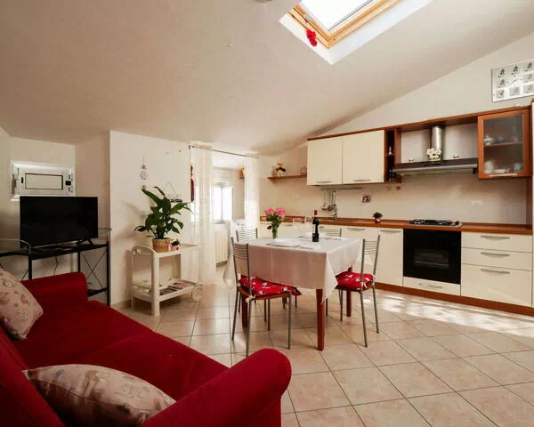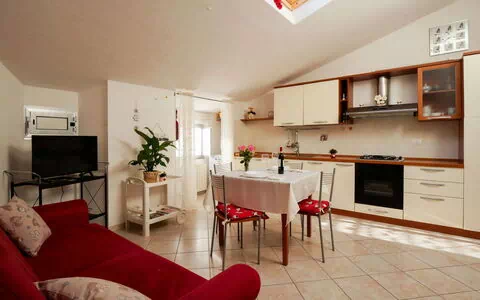 L'appartement « Stefi » est situé au deuxième étage d'un immeuble et offre 55 mètres carrés d'espace de vie lumineux. Il accueille un maximum de 4 personnes et comprend 2 chambres et 1 salle de bains. L'appartement se caractérise par des plafonds mansardés et un mobilier confortable. Le séjour et la salle à manger sont aménagés avec une table à manger. La première chambre est une chambre double équipée d'un téléviseur écran plat et d'une climatisation. La deuxième chambre dispose de 2 lits simples de 80 cm de largeur. La cuisine, en espace ouvert, est équipée d'un four, de 4 plaques de cuisson au gaz, d'un lave-vaisselle, d'un grille-pain, d'une bouilloire, d'un congélateur et d'une cafetière électrique. La salle de bains est dotée d'une douche, d'un bidet et d'un WC.