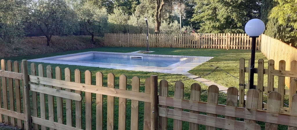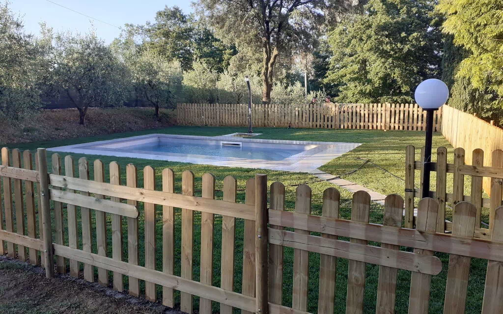 La piscine privée, clôturée pour la sécurité, est disponible du 1er mai au 30 septembre. Elle est entourée par la beauté naturelle de la colline boisée. Une pelouse bien entretenue offre un espace idéal pour se détendre au soleil. Le jardin de la faune et le jardin naturel ajoutent une atmosphère sauvage aux terrains. Une douche extérieure est disponible après la baignade. Du mobilier de jardin est disposé dans les espaces extérieurs pour permettre aux hôtes de se relaxer. Un barbecue est à disposition pour les repas en plein air.