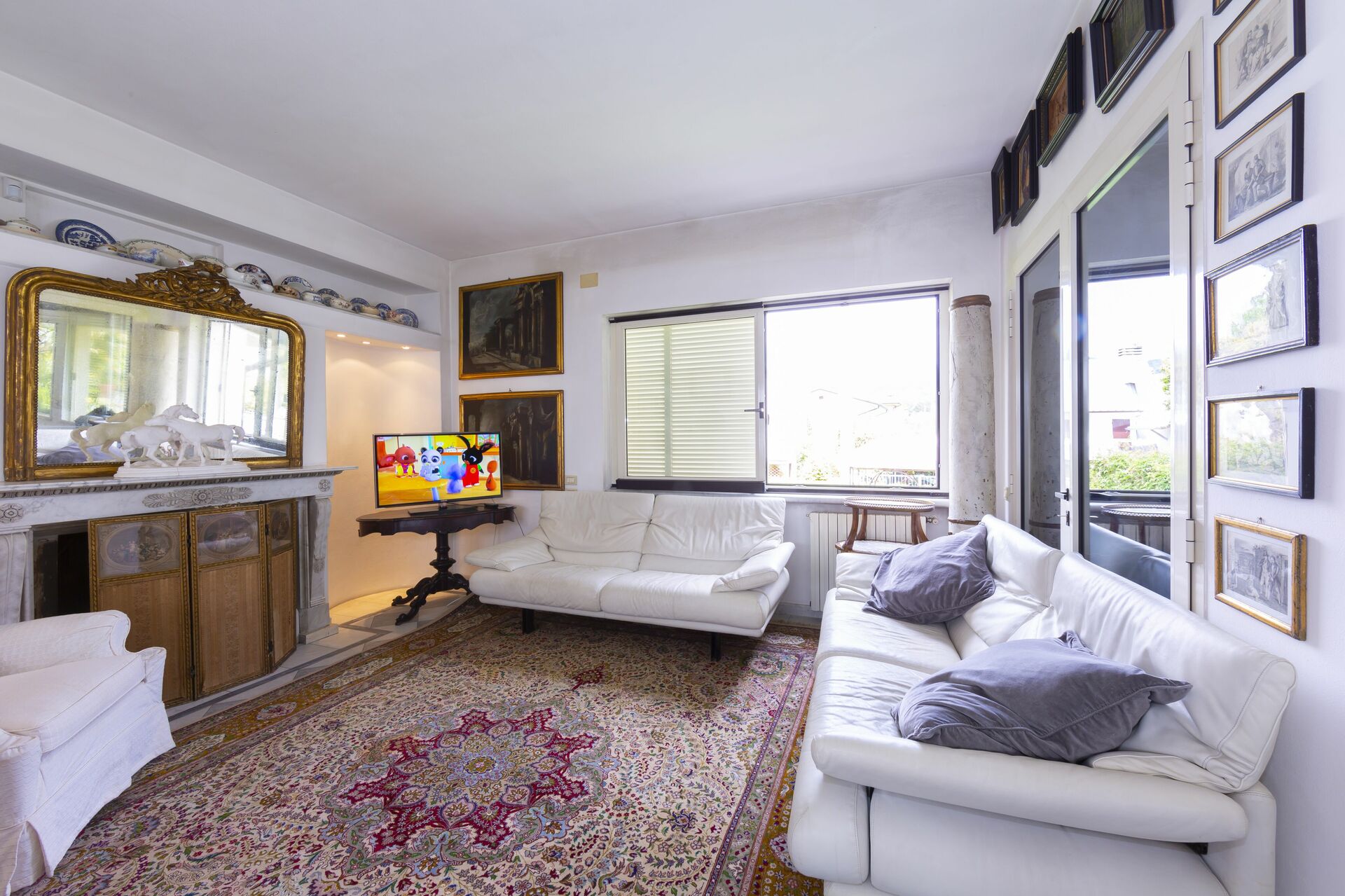 Salon: deux canapés, fauteuil, table à manger (personnes: 8), télévision.