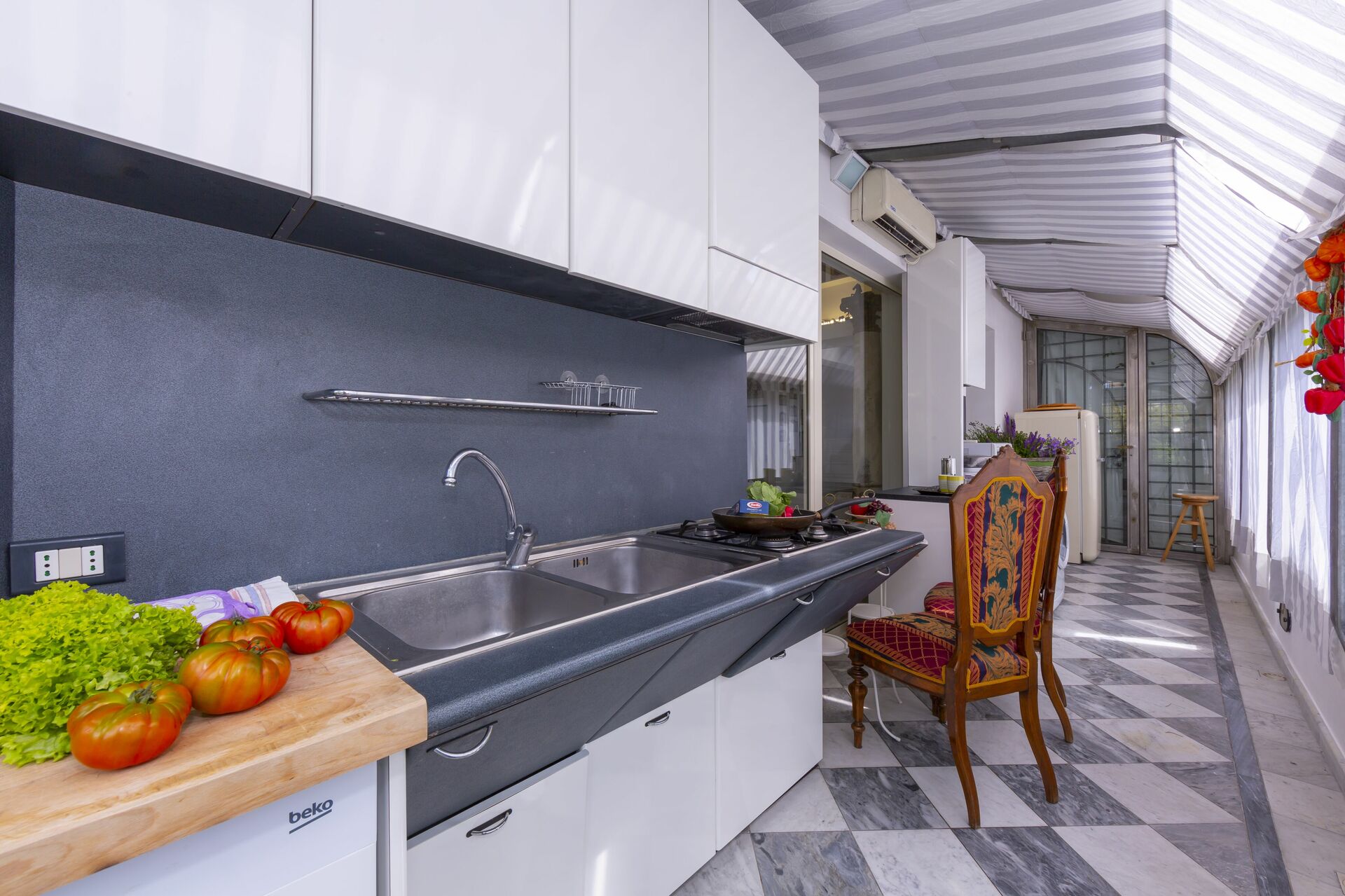 terrasse: espace extérieur pour les repas en plein air, table à manger (personnes: 4), meuble de terrace, chaise longue.