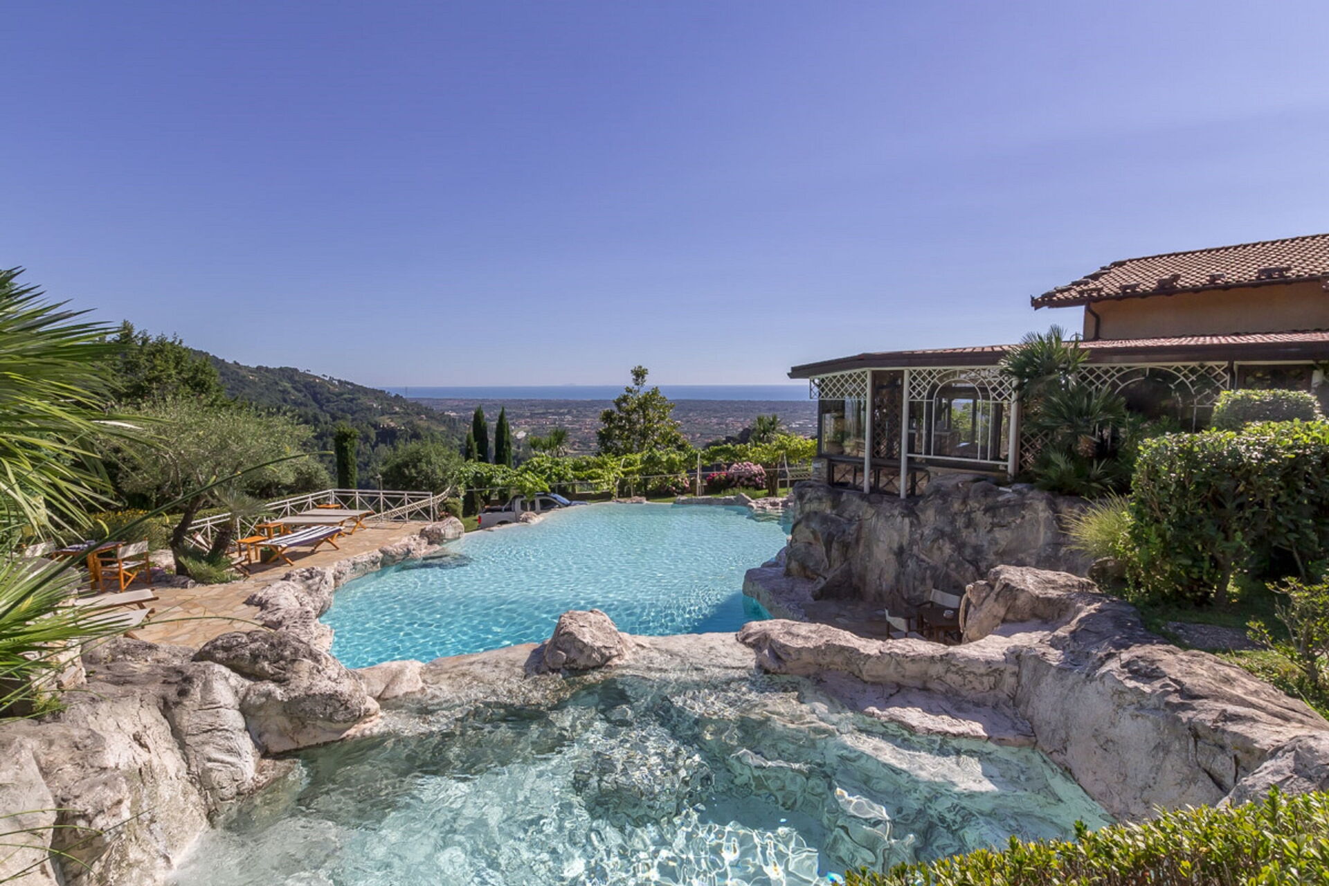 jardin: piscine (en plein air), barbecue, chaise longue, clôturé /clôturée.