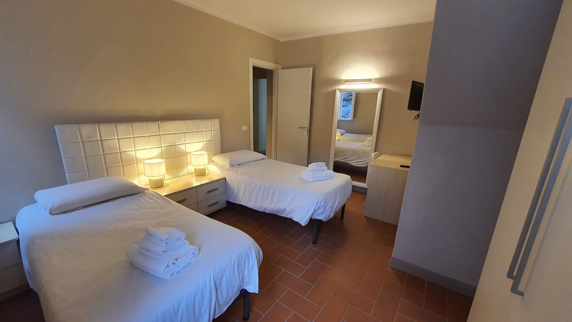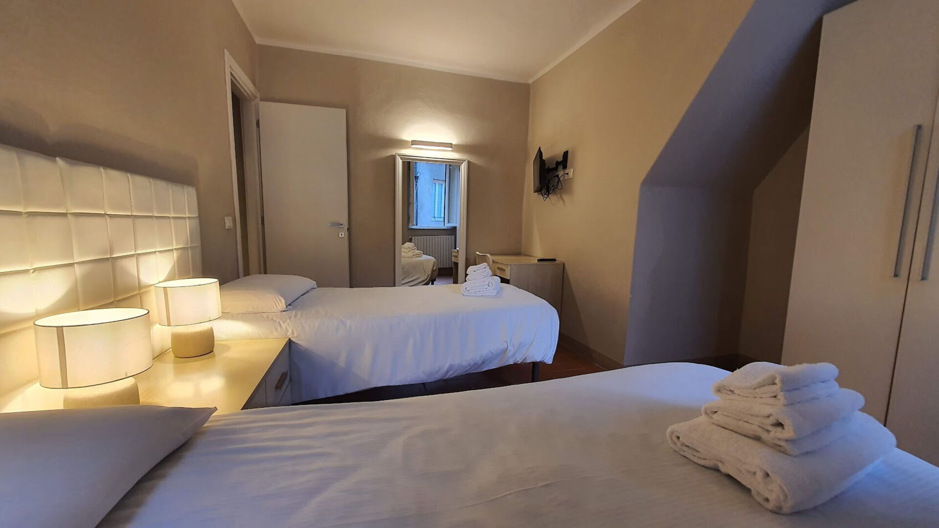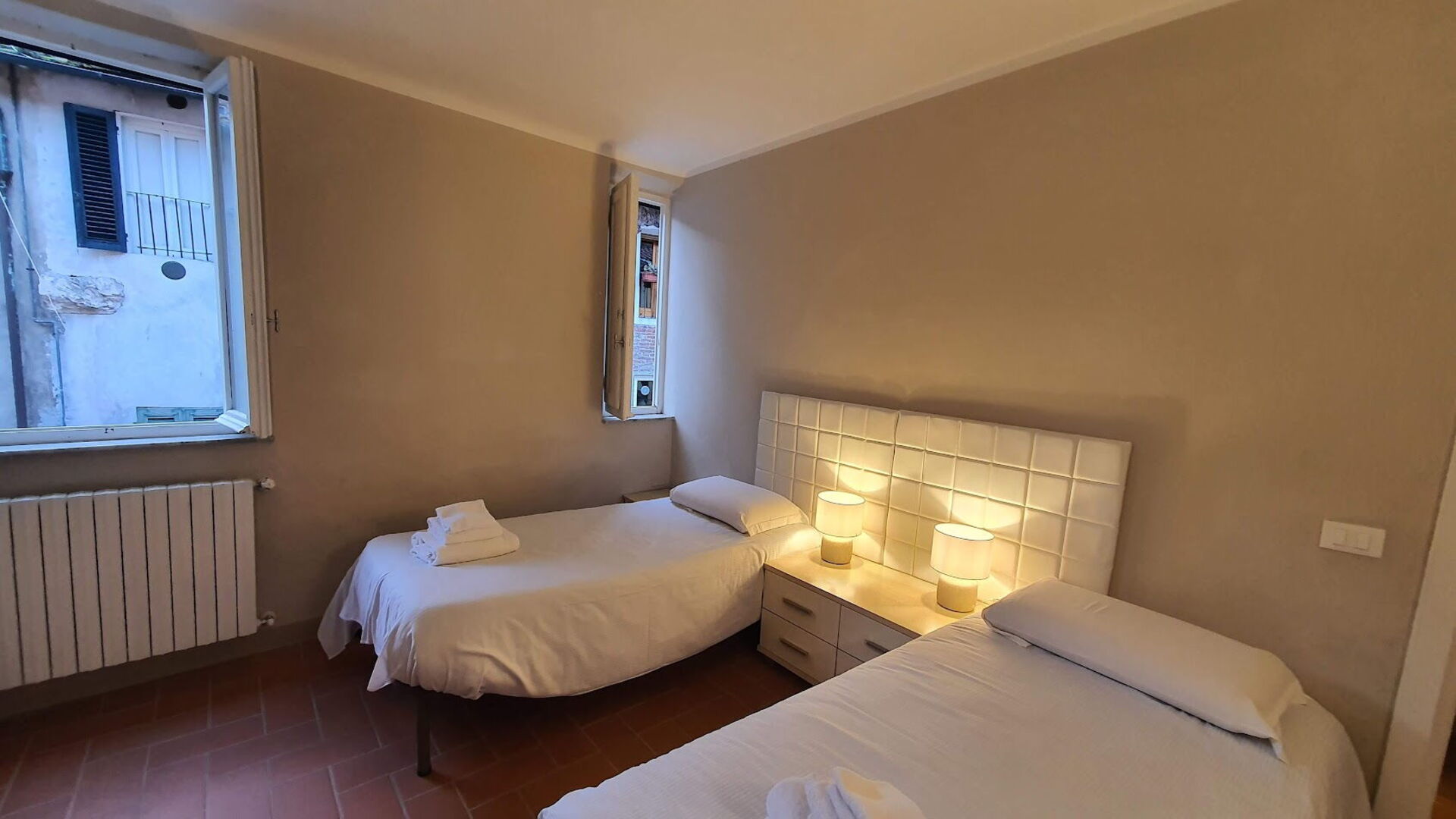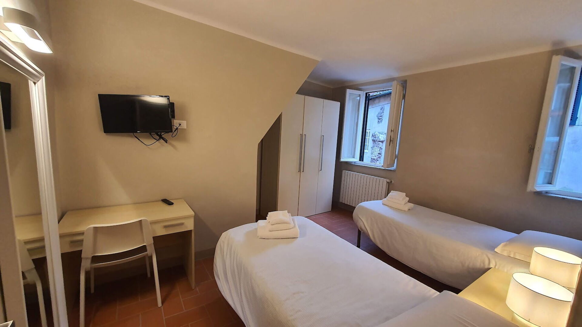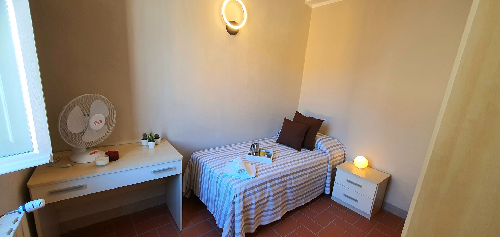chambre à coucher 2: deux lits à une place, ventilateur portable, bureau.