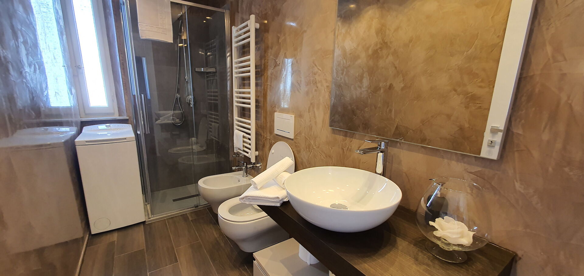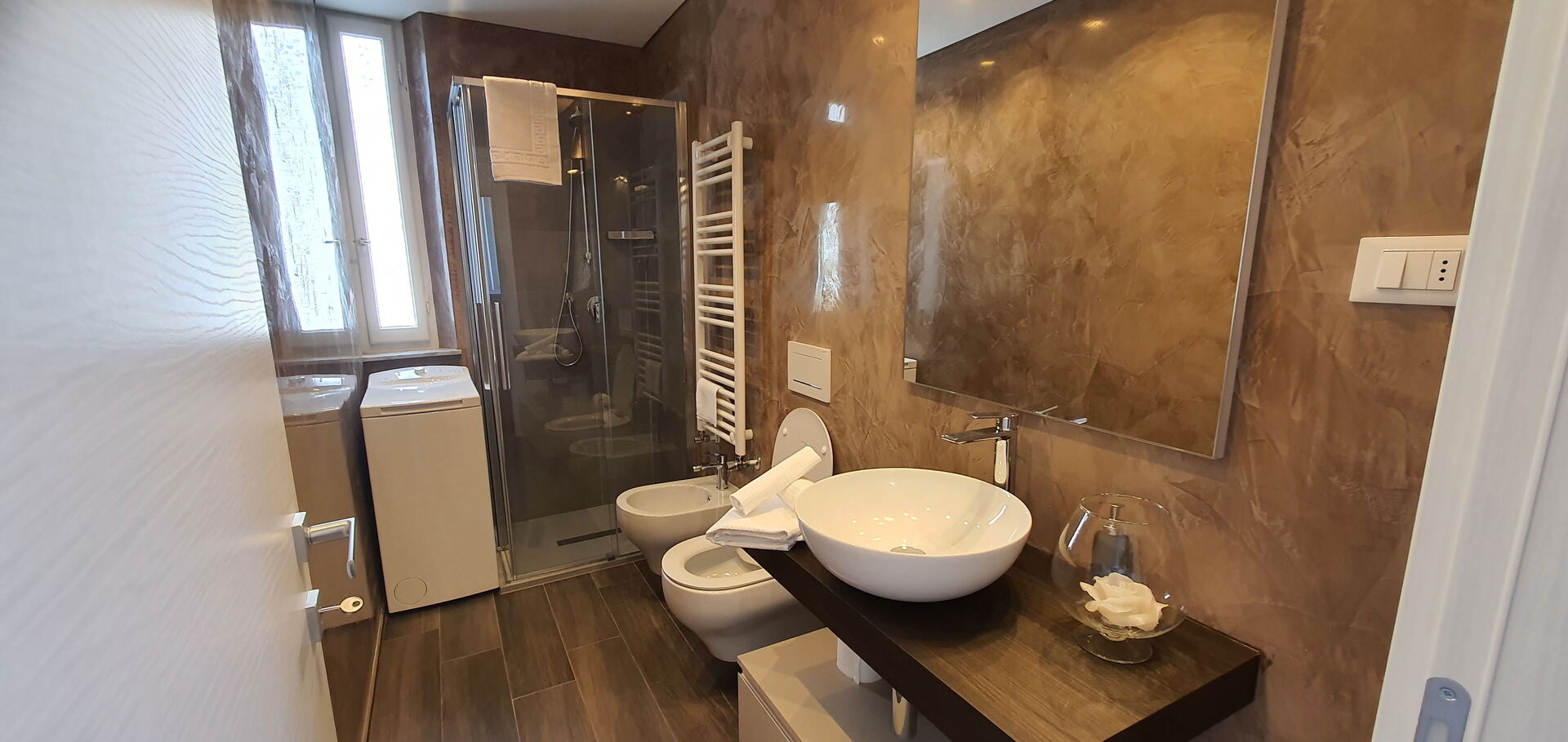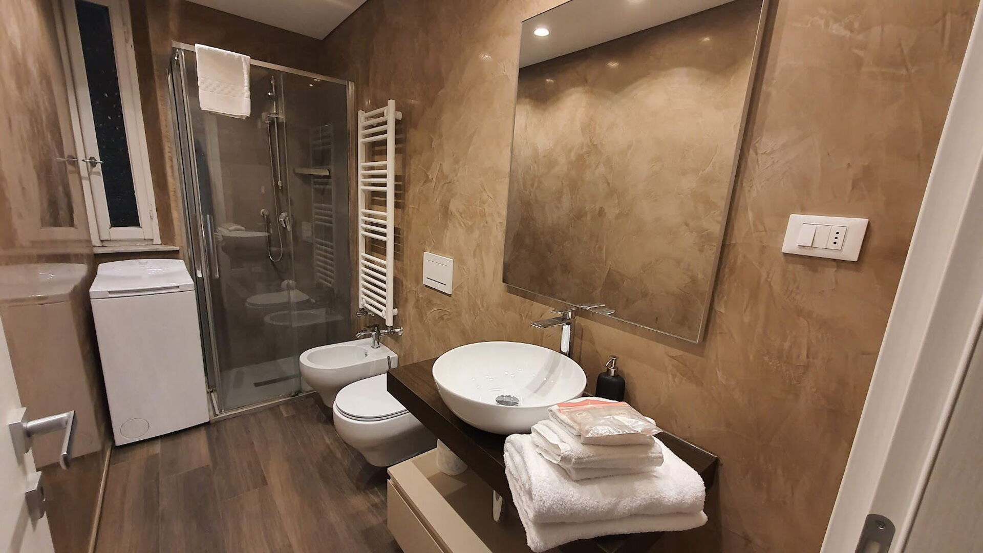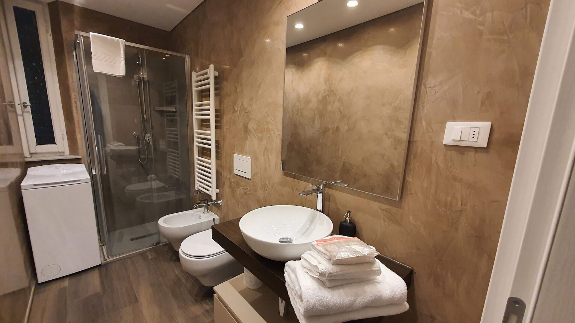 salle de bain: bassin, wc, bidet, douche, lave-linge.