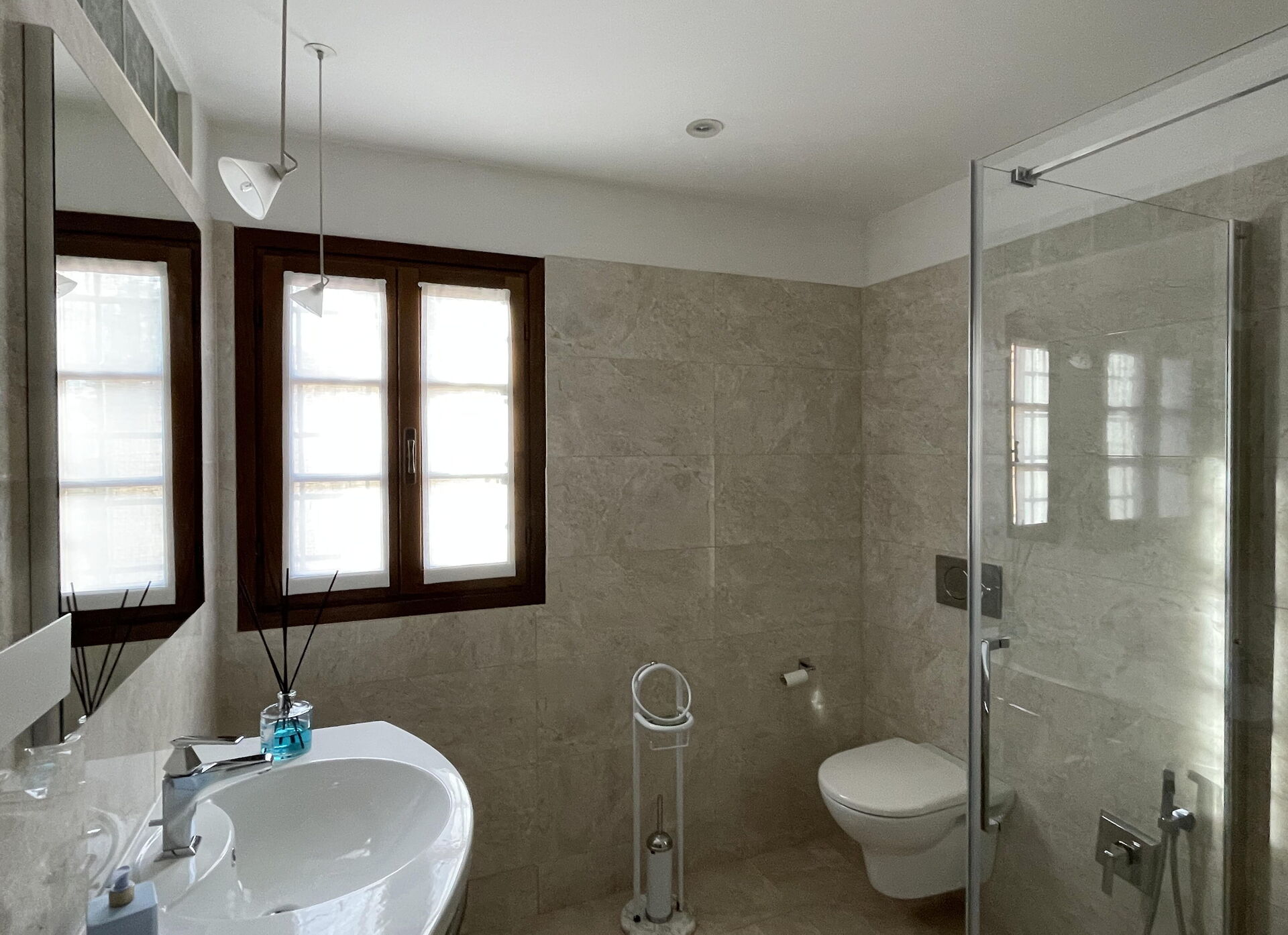 chambre avec salle de bain 3: deux lits à une place, internet WIFI, climatisation, moustiquaires, bassin, wc, bidet, douche.
