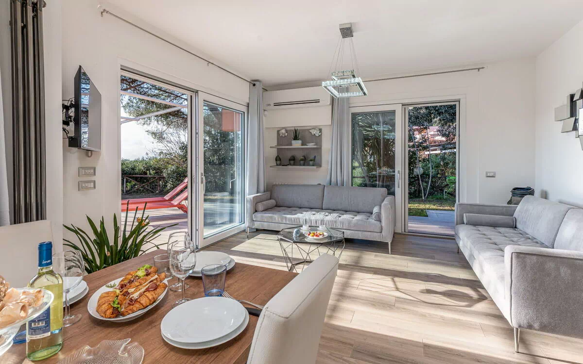 "Villa Marzia Mare & Golf", maison 5 pièces 120 m2. Spacieux et clair, complètement rénovée en 2022, aménagement très moderne et de style: séjour/salle à manger avec baie vitrée avec TV (écran plat), air-conditionné. Sortie sur le jardin, sur la terrasse. 2 chambres doubles, chaque chambre avec: TV (écran plat), air-conditionné. Sortie sur le jardin, sur la terrasse. 1 chambre avec 2 lits (80 cm), TV (écran plat), air-conditionné. Sortie sur le jardin. 1 chambre double avec TV (écran plat), air-conditionné. Cuisine ouverte (four, lave-vaisselle, Poêle à gaz, 5 feux, grille-pain, bouilloire électrique, micro-ondes, cafetière électrique) avec table pour les repas. Sortie sur la terrasse. 2 douches/bidet/WC. Chauffage au gaz, air-conditionné. Sol en pierres naturelles. Grande terrasse partiellement couverte, jardinet. Meubles de terrasse, mobilier de balcon, barbecue, chaises longues. Superbe vue panoramique sur la mer. A disposition: lave-linge, fer à repasser, moustiquaire, chaise haute pour enfant, lit bébé jusqu'à 2 ans, sèche-cheveux. Internet (Connexion WIFI, gratuit). Place de parking (cloturée, 4 Voitures) près de la maison. Veuillez noter: logement non-fumeur. Détecteur de fumée, extincteur. IT053006C29R99GGNH