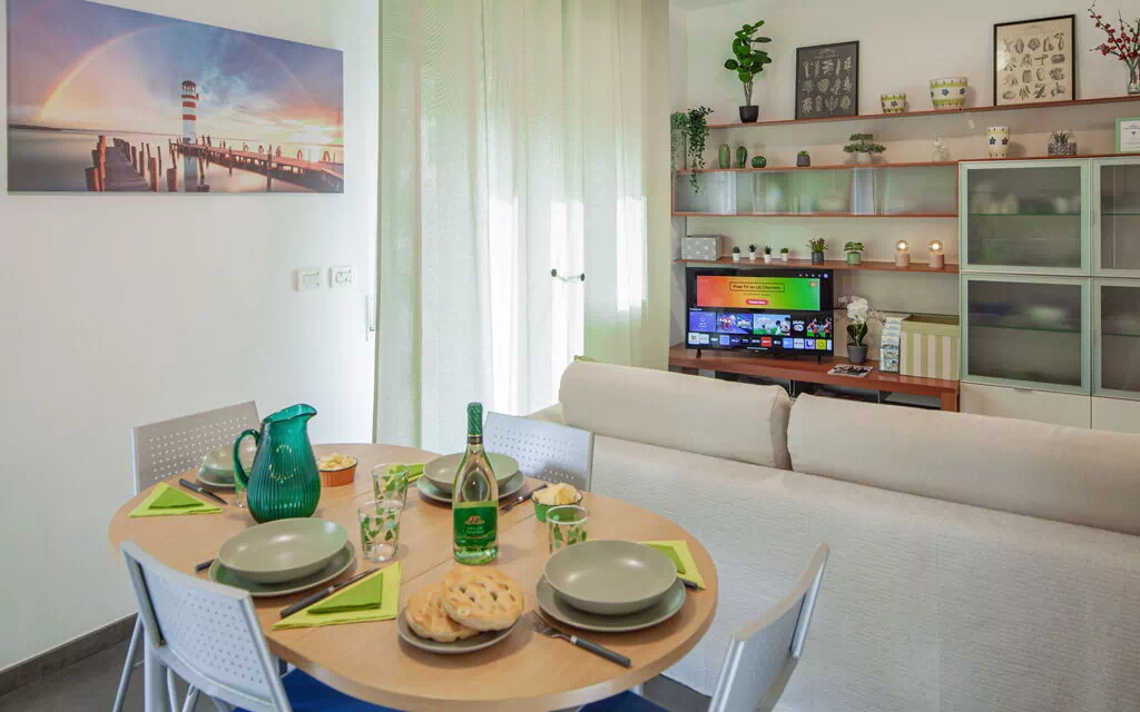 L'appartement Serena est composé de deux chambres : une avec un lit double, une avec un lit double et un lit simple. Les deux chambres sont équipées de la climatisation.