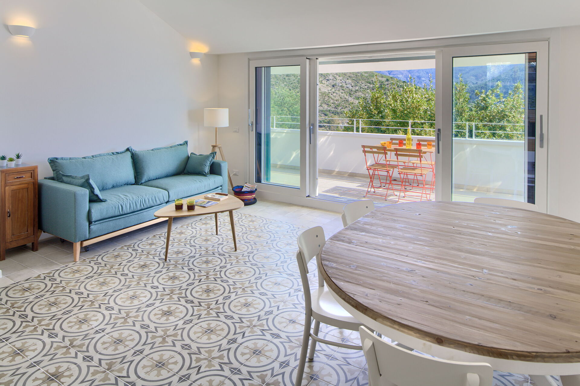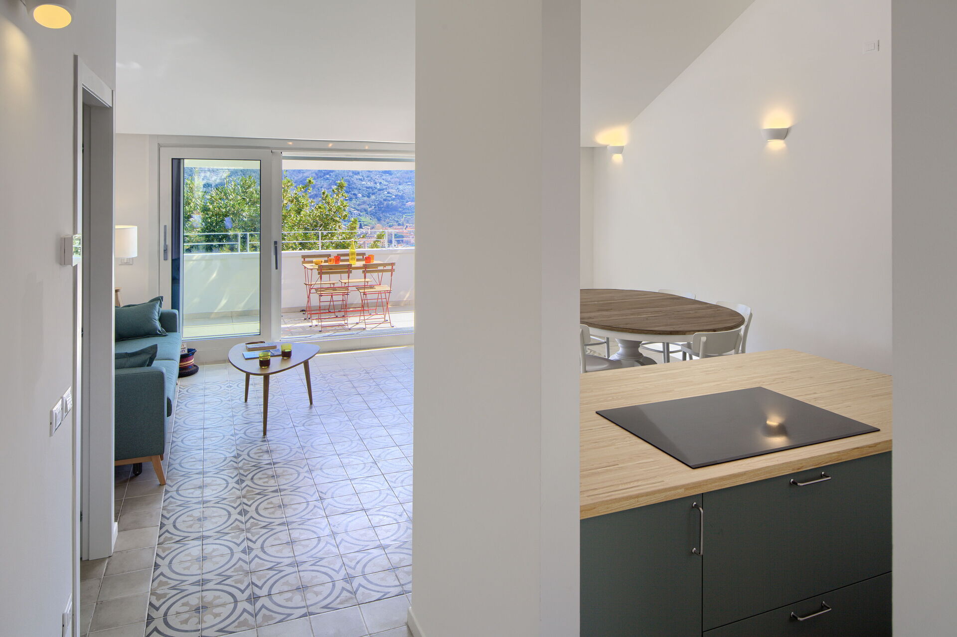 L'appartement est neuf et élégamment meublé. Il dispose d'un grand salon-cuisine à aire ouverte, de deux chambres doubles, d'une chambre avec deux lits simples et de deux salles de bains.
